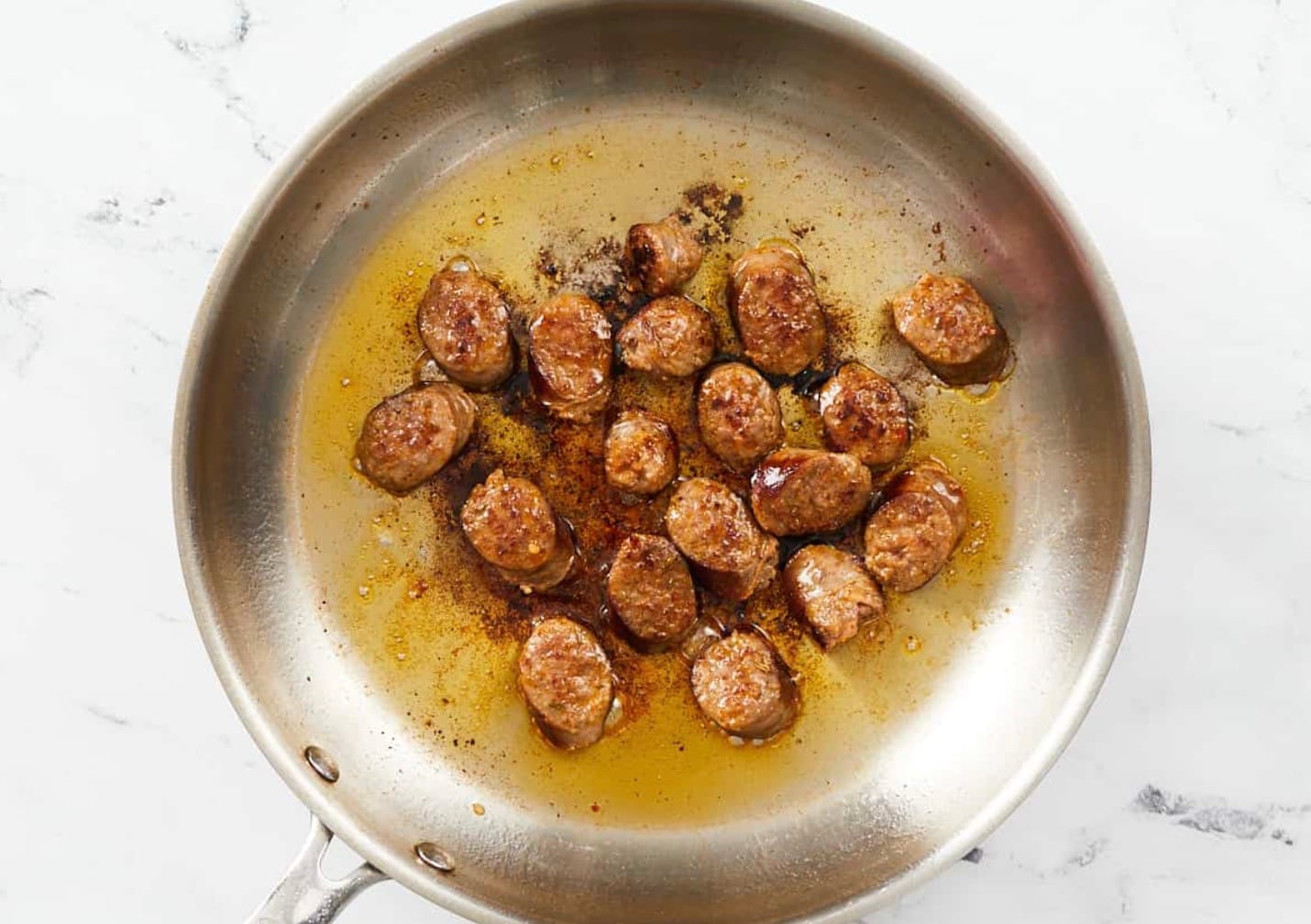Take the sausage out and slice it into medallions. Put it back in the skillet to cook through. Remove to a plate when done.
