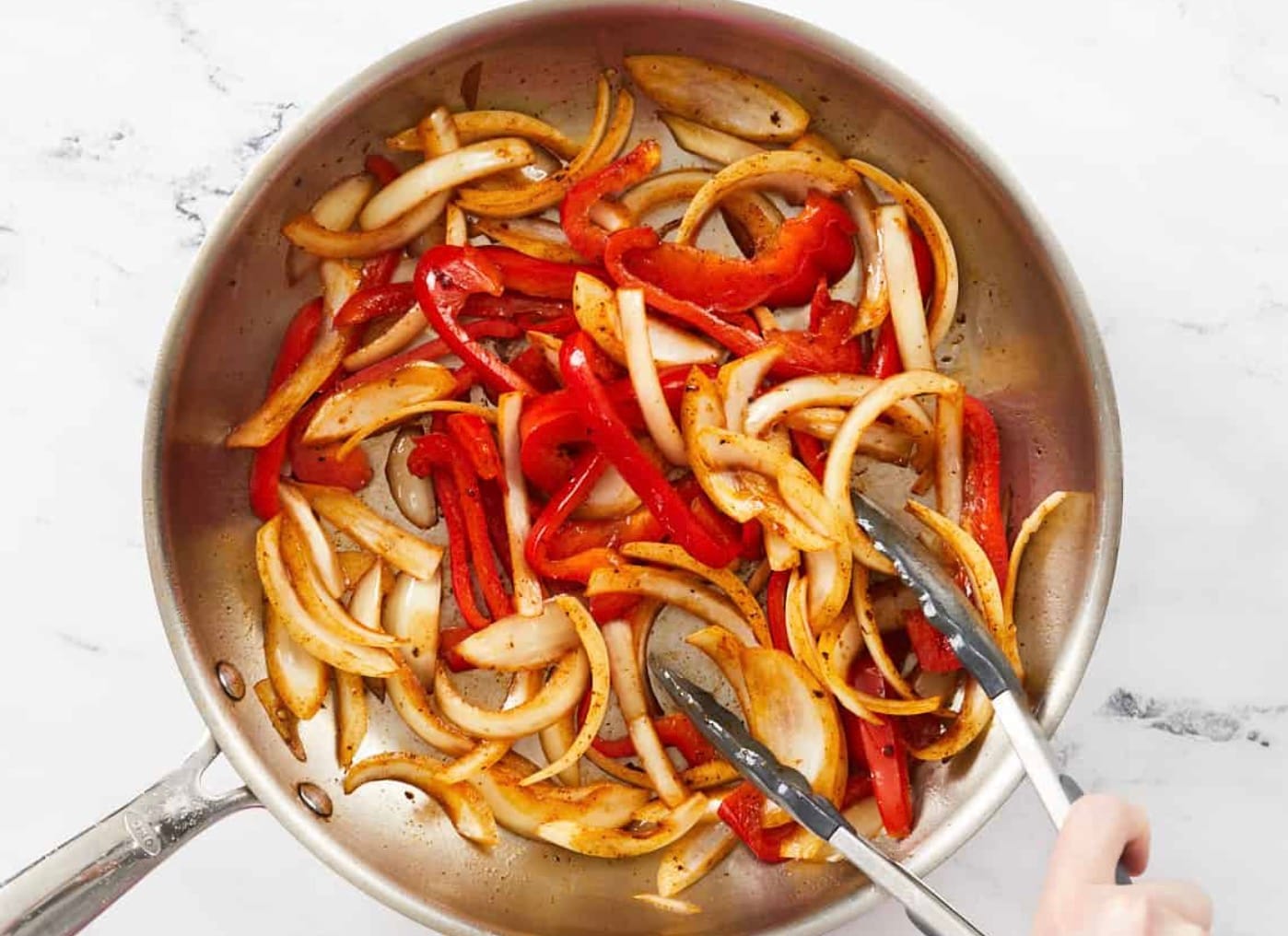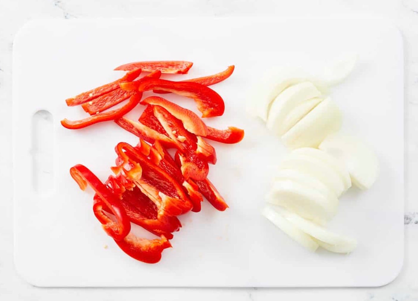 While the sausage cooks, cut the pepper and onion into thin strips. Cook these veggies in the skillet until they start to soften.