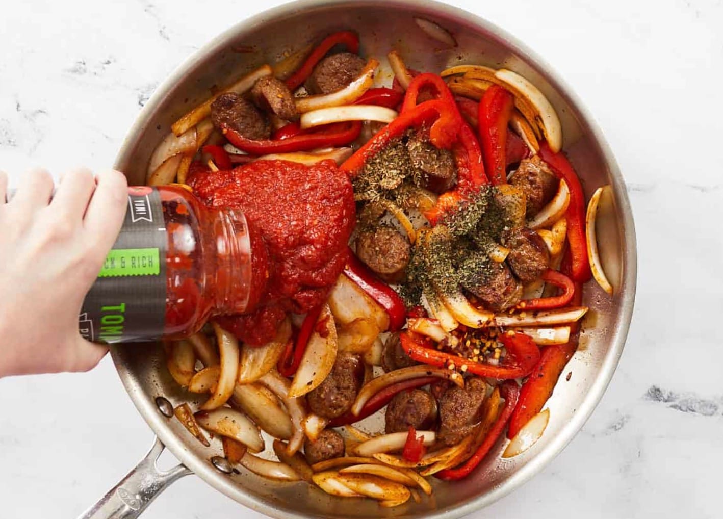 Add the sausage back to the pan. Pour in the pasta sauce and sprinkle in the basil, oregano, and red pepper. Stir everything together and let it heat up.