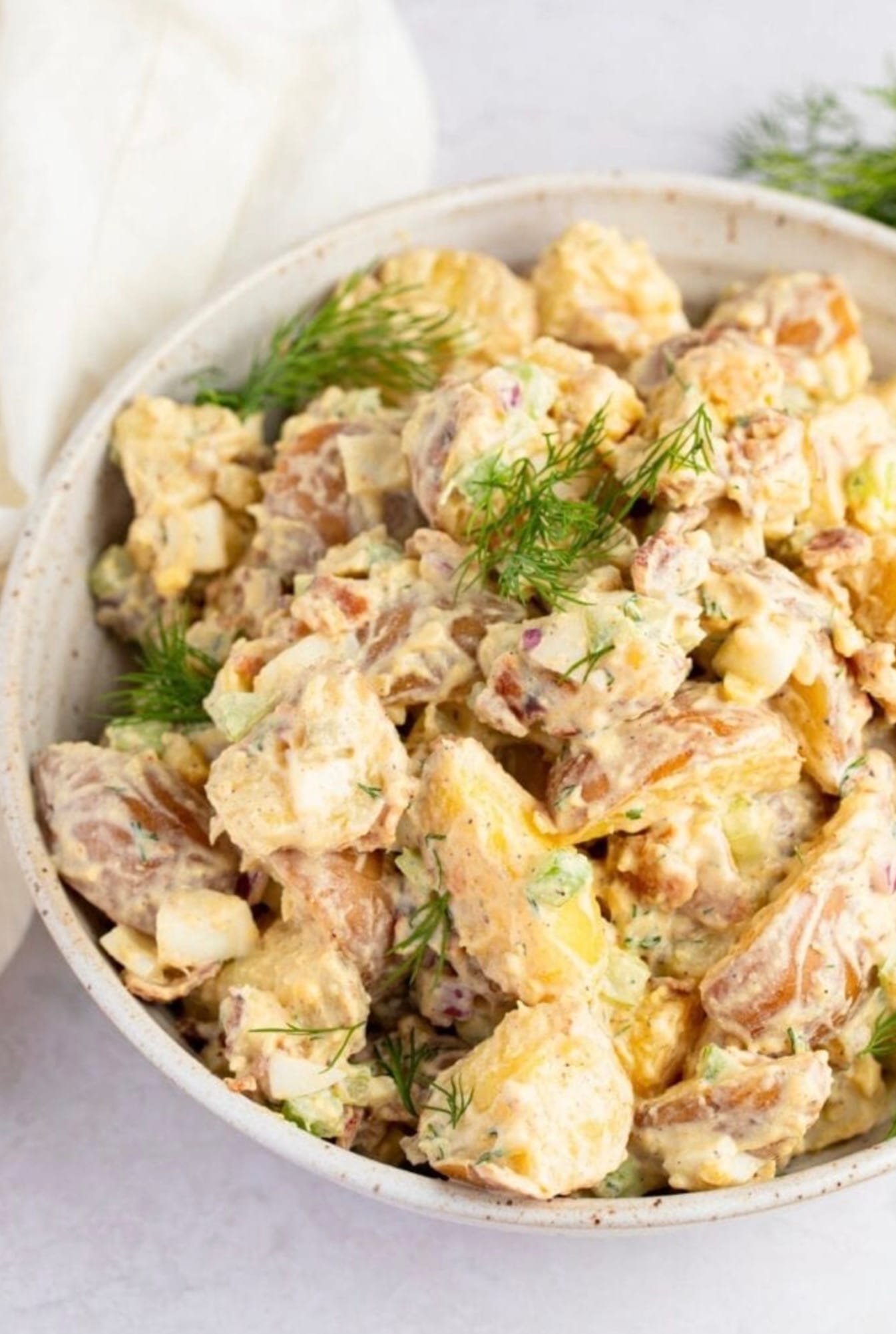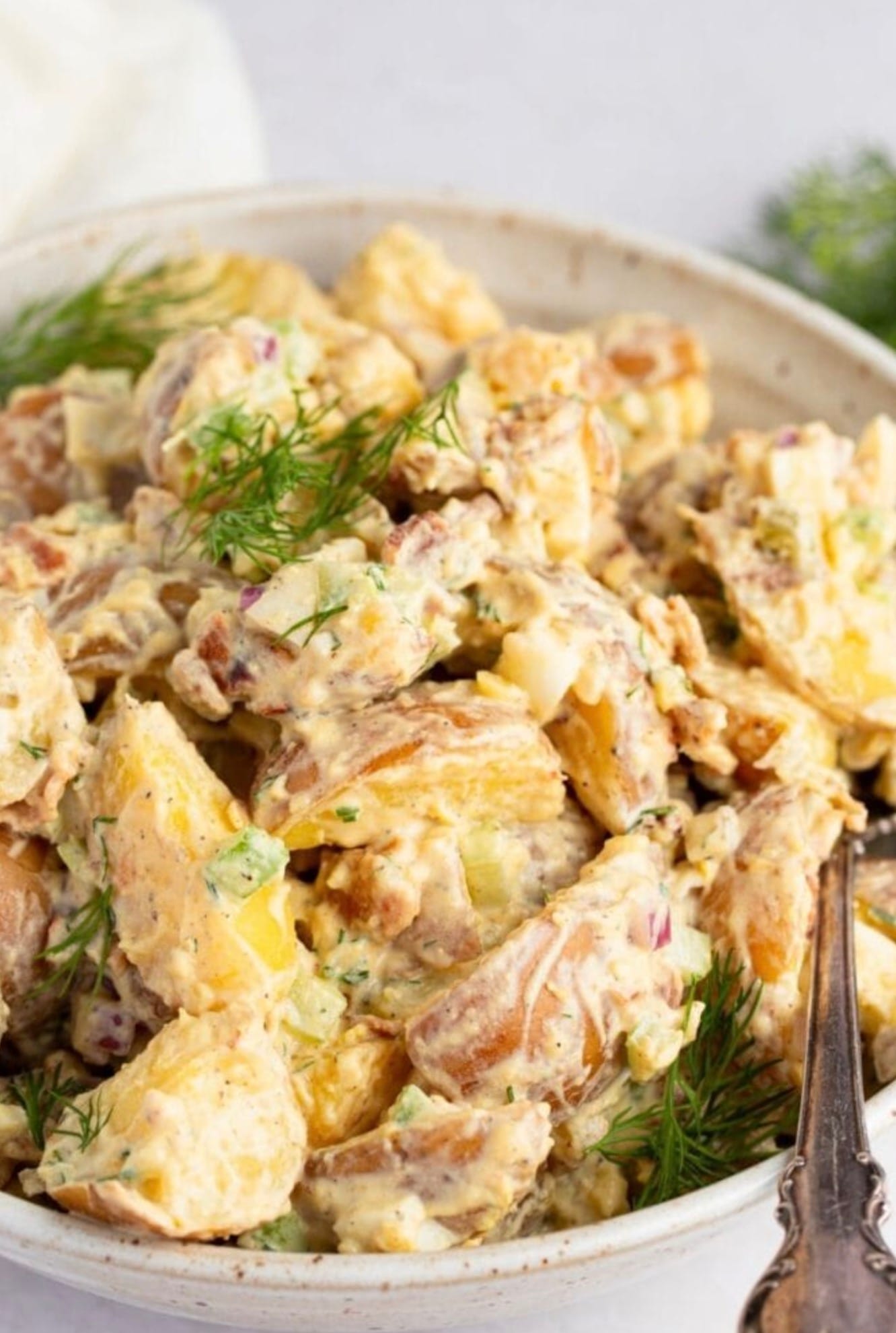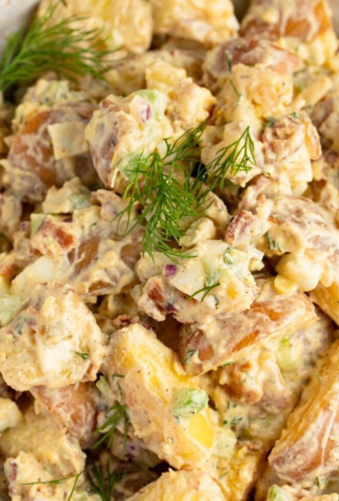 You’ll love how easy it is to make this potato salad. The creamy dressing mixes mayo and sour cream with fresh dill for a zesty flavor. Adding crispy bacon, hard-boiled eggs, celery, and red onion gives it great texture and taste. You can make it ahead of time and keep it in the fridge for up to 3 days before serving.