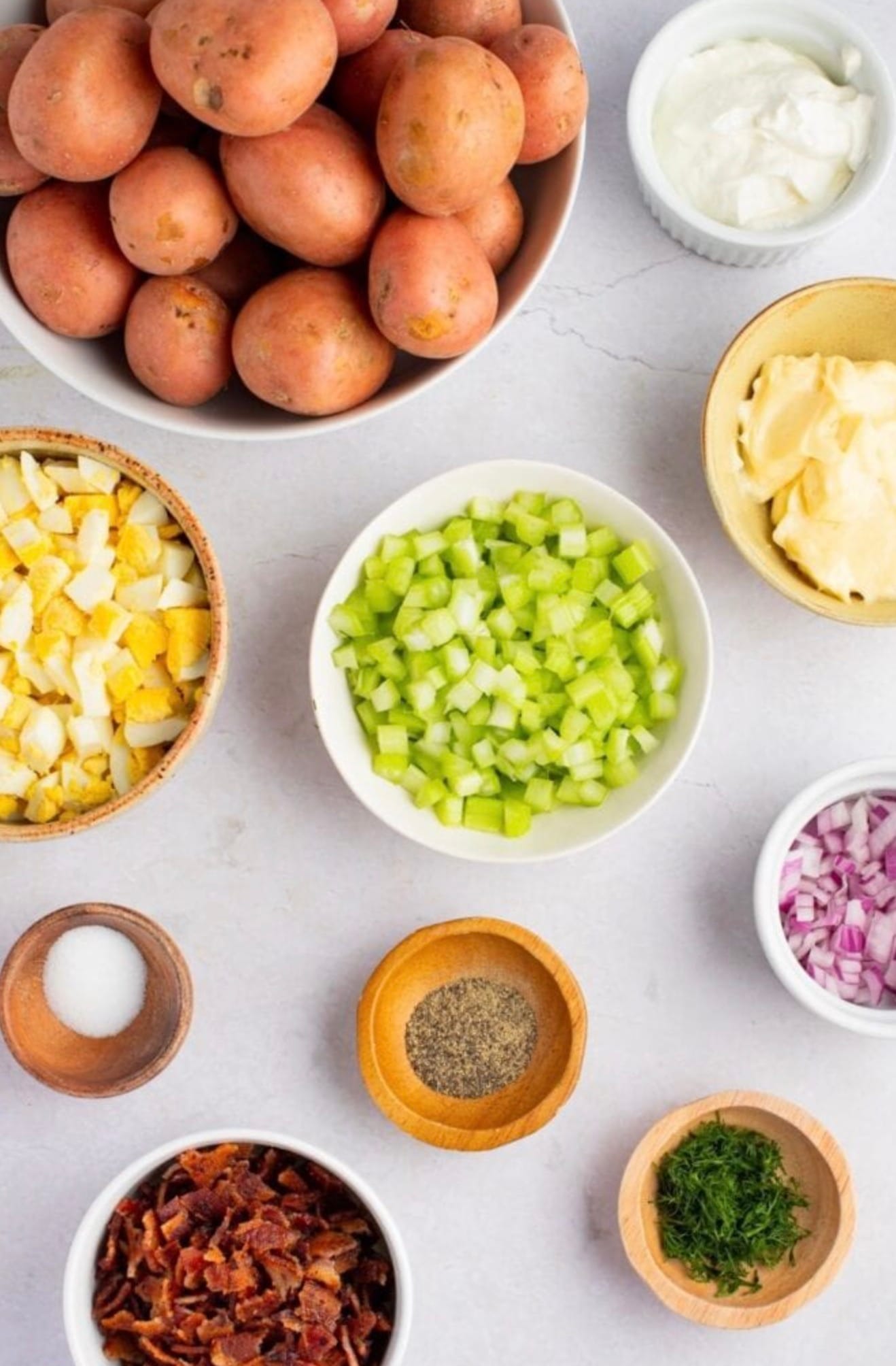 The fresh dill gives a pop of color and taste. You can adjust the salt and pepper to your liking. Make sure to cook and crumble the bacon before starting.