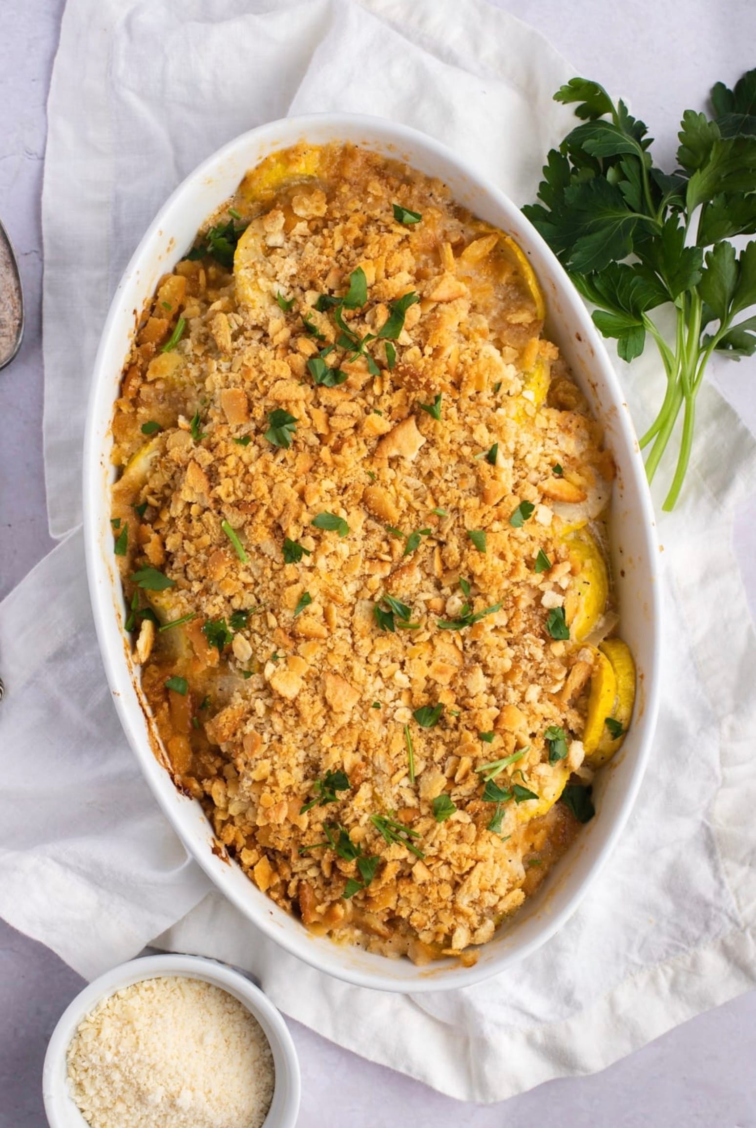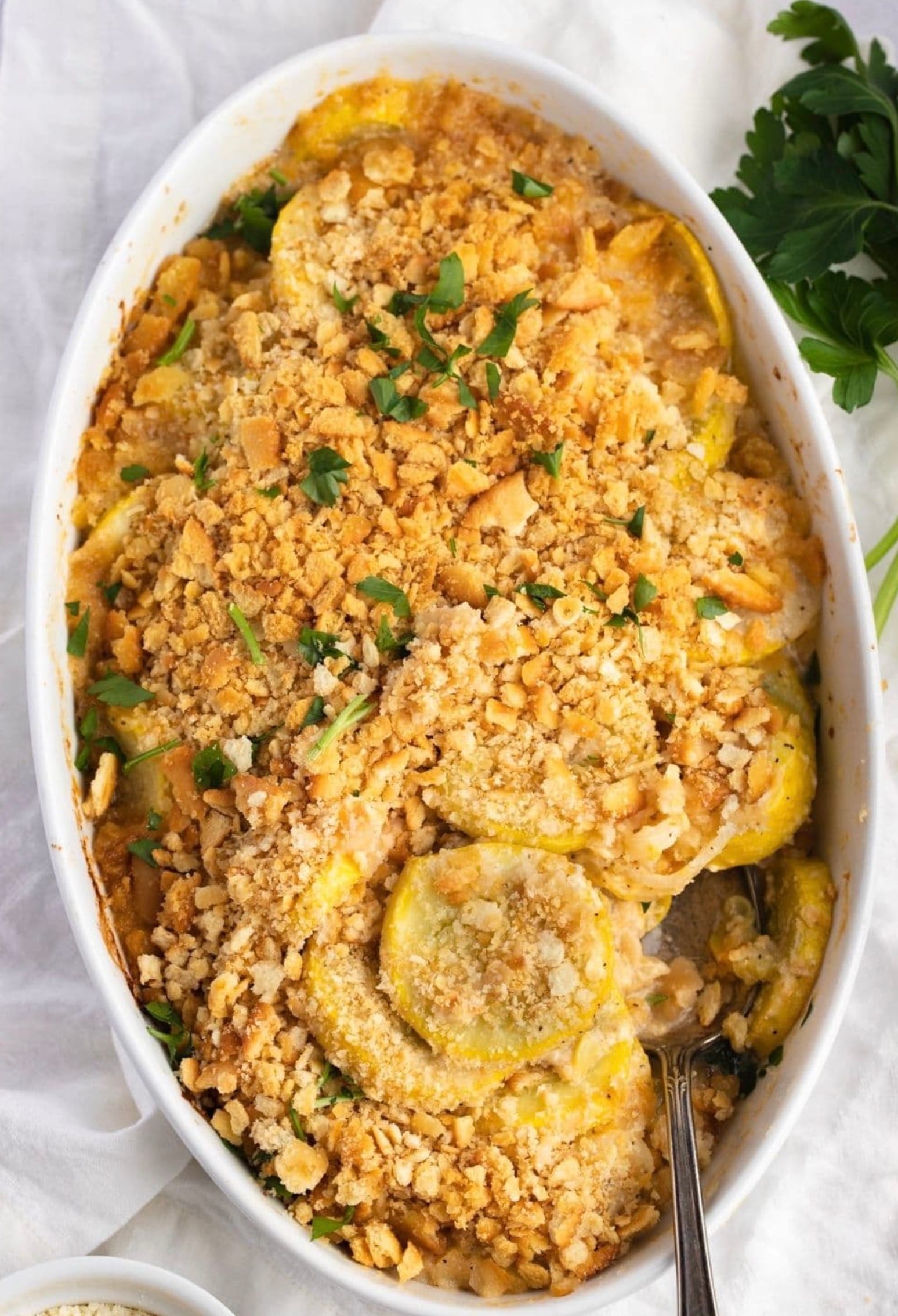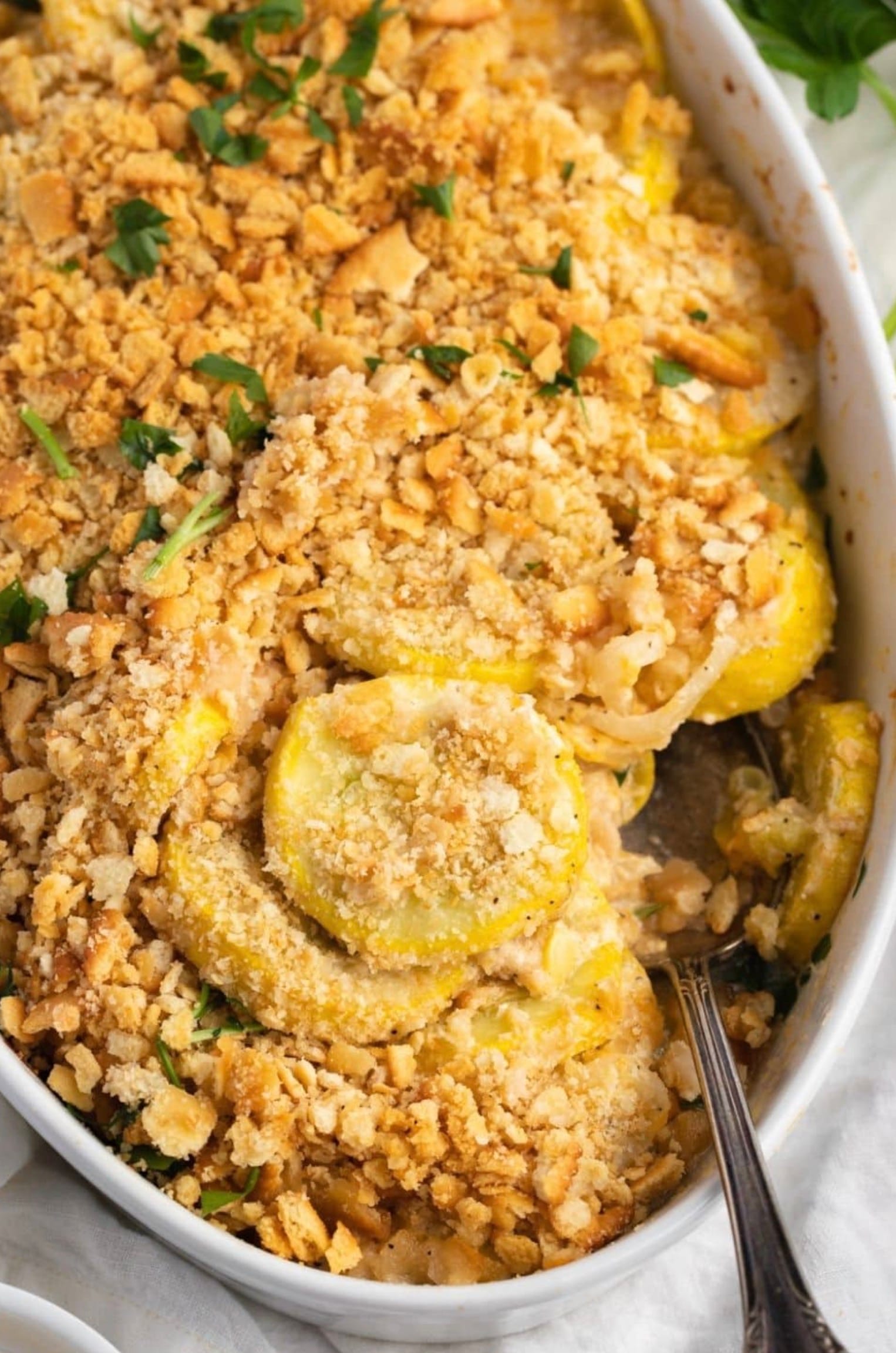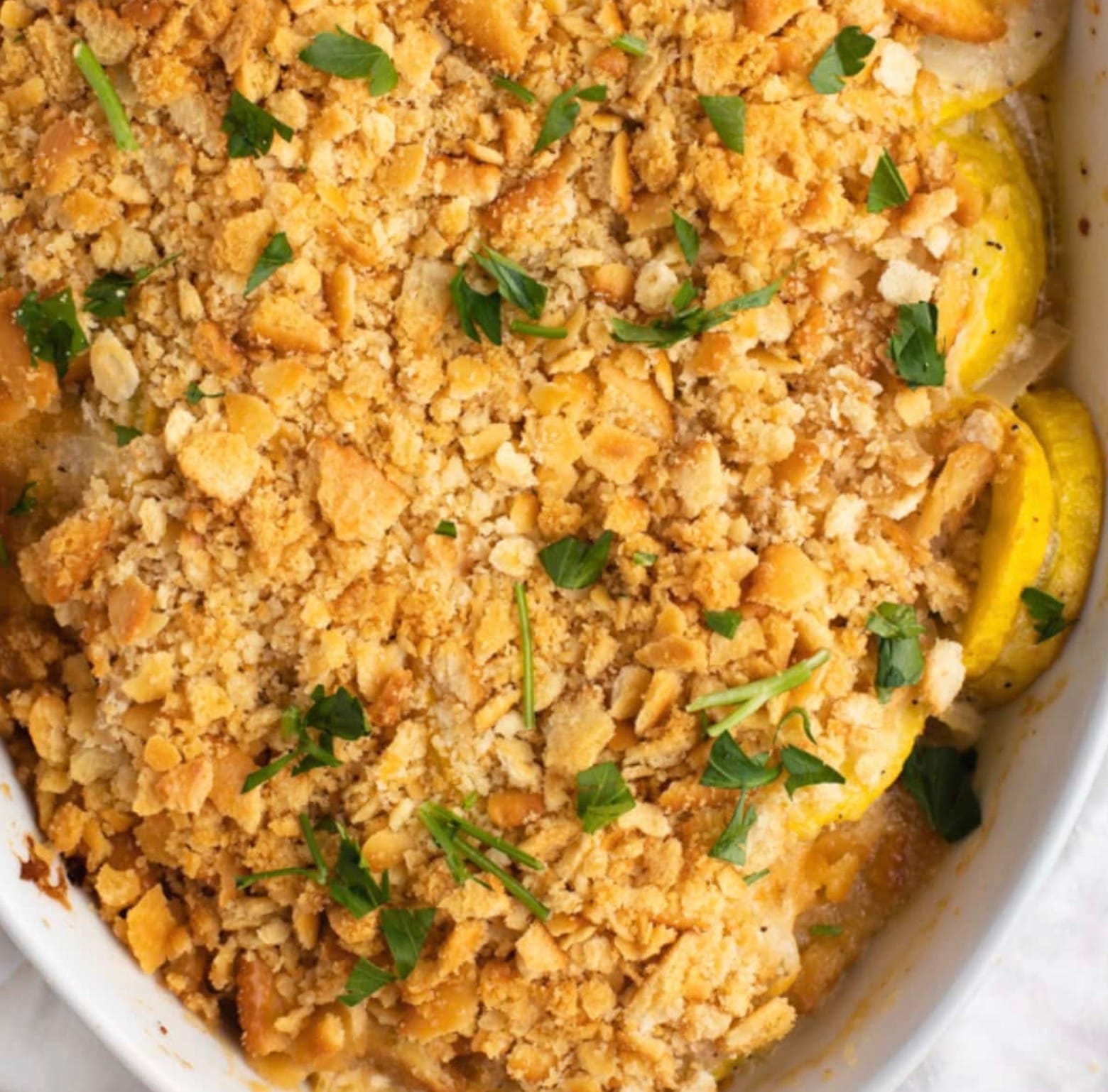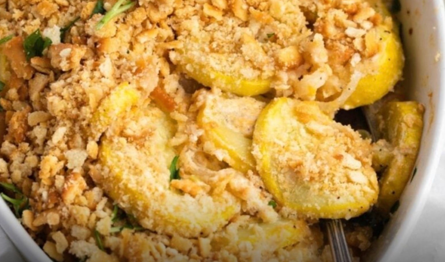 You’ll need summer squash, onions, cheese, and butter crackers. The squash and onions are cooked until soft, then mixed with cheese and sour cream. It’s all topped with crushed crackers and baked until golden. The result is a creamy, crunchy casserole that’s perfect for family dinners or potlucks.