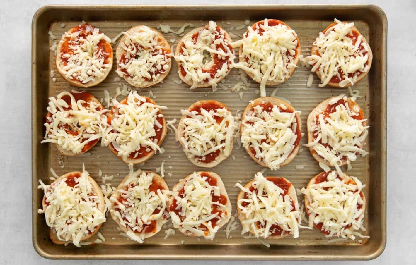 Top the Bagels: Spread each bagel with 1 tablespoon of pizza sauce and top with 2 tablespoons of shredded cheese, as well as any of your desired toppings.