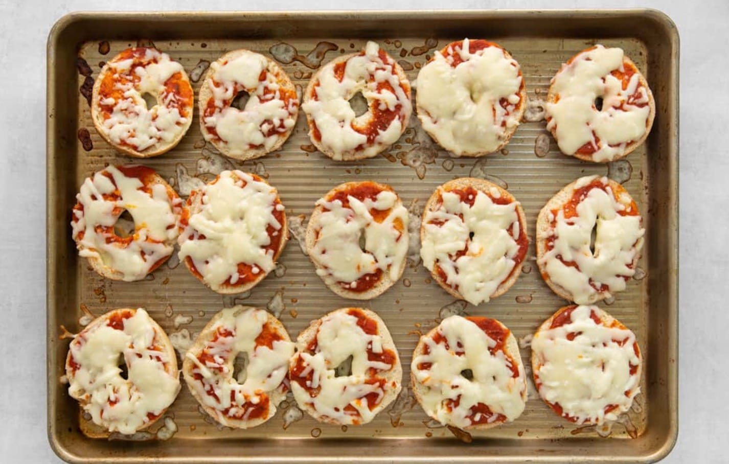 Remember to preheat your oven to 425°F before you start. You’ll also need a rimmed baking sheet to cook your pizza bagels on.