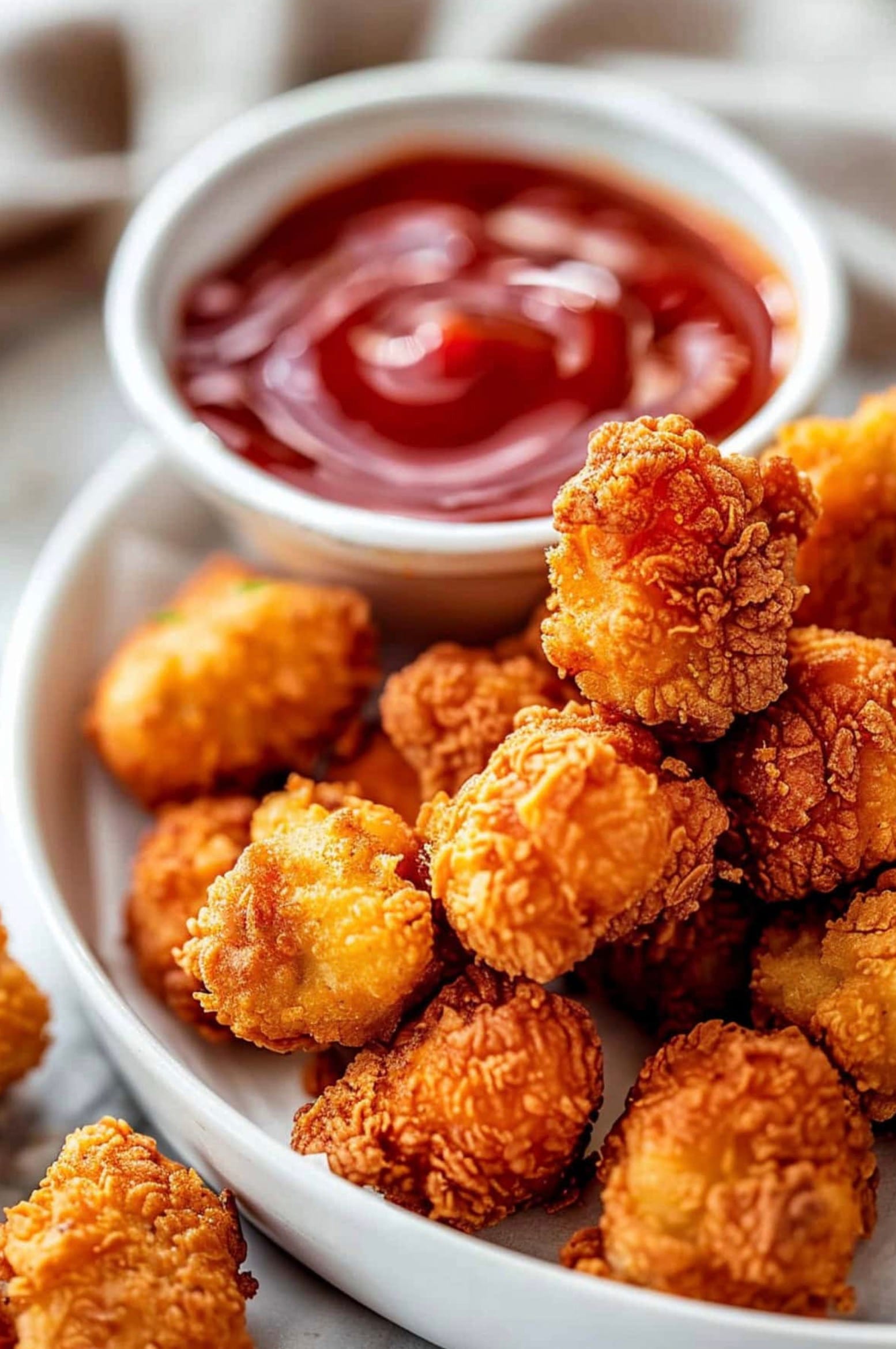 The chicken is marinated in buttermilk with garlic and spices, then coated in a mix of flour, cornstarch, and seasonings. It’s dipped in egg and rolled in panko breadcrumbs for a crunchy outside. After frying, the popcorn chicken can be served with dipping sauces like ranch or honey mustard for a yummy meal.