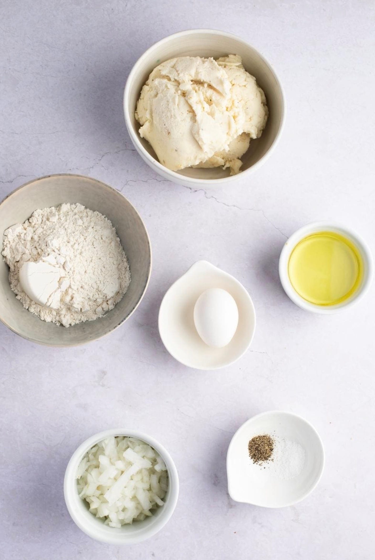 Start by gathering all your ingredients. In a big bowl, mix 2 cups of cold mashed potatoes, 1 cup of flour, 1 diced onion, and 1 egg. Stir until you get a thick, creamy batter. Add 1/2 teaspoon each of salt and pepper for flavor.