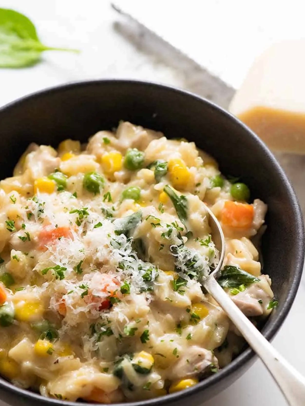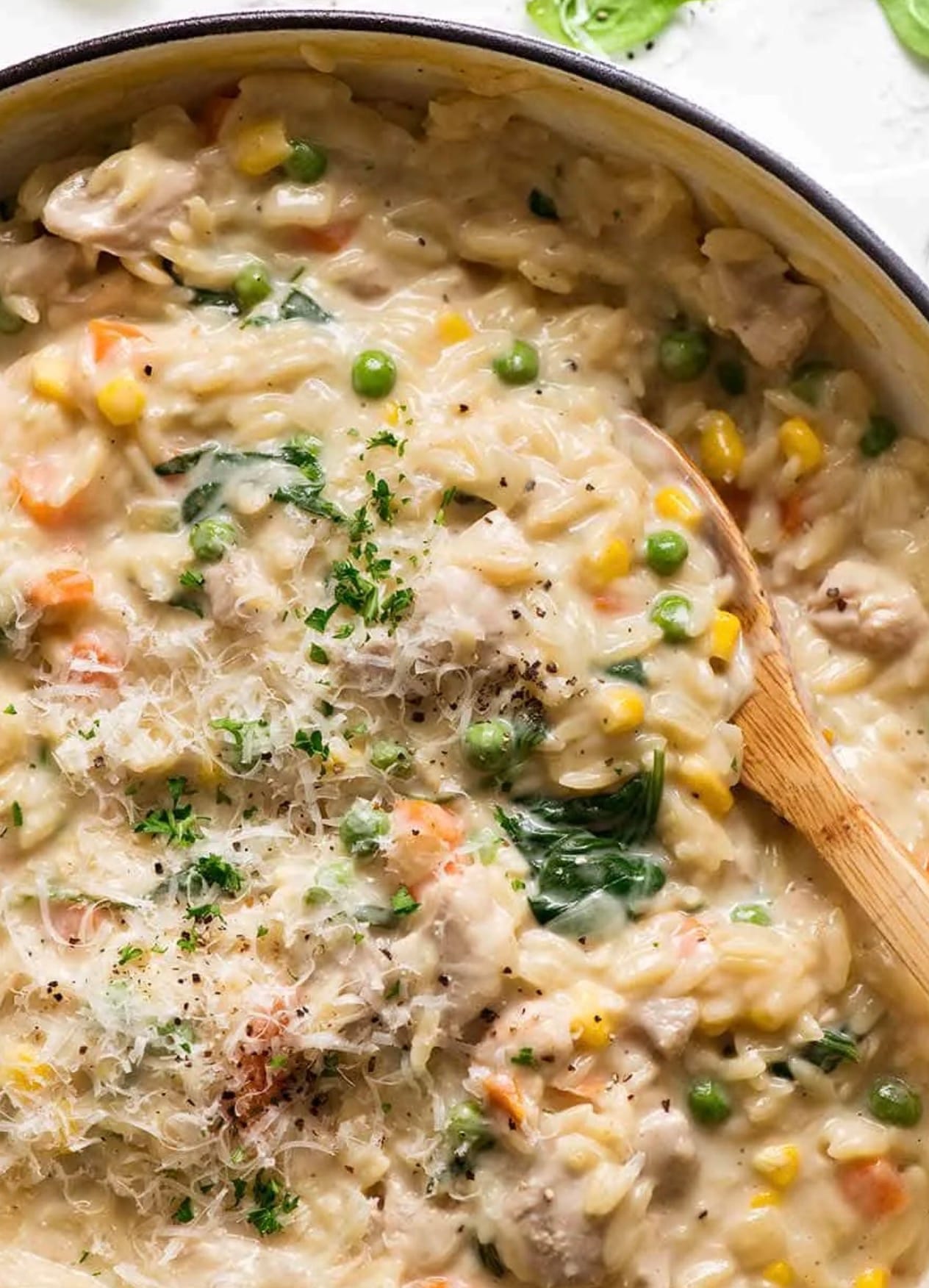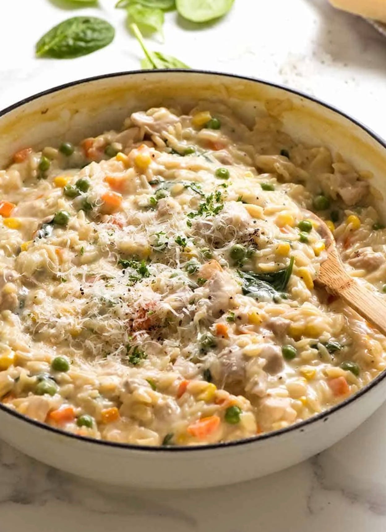 Risoni, also known as orzo, is a small pasta that cooks up fast and soaks up all the yummy flavors in this dish. You’ll love how the juicy chicken, creamy parmesan sauce, and colorful veggies come together in this simple recipe. It’s a great way to feed your family a tasty meal without spending hours in the kitchen.