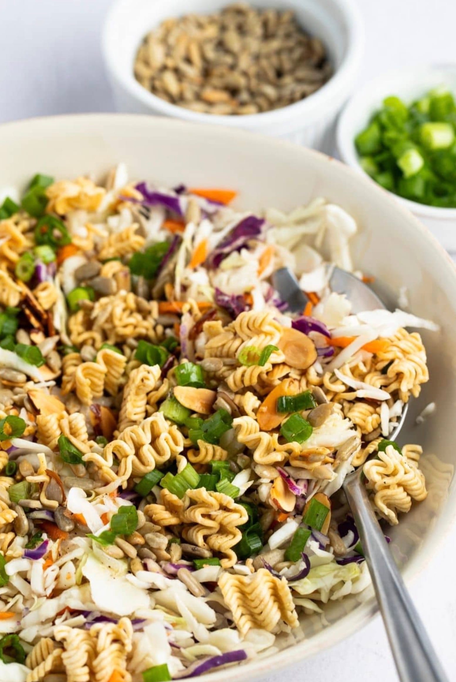 For the crunchiest salad, toast the ramen noodles, sunflower seeds, and almonds until they’re golden brown. Keep a close eye on them to avoid burning.