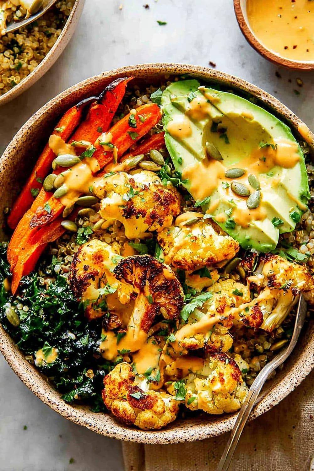 - 8 Assemble bowls by dividing the quinoa and kale mixture evenly between four serving bowls. Arrange the roasted vegetables on top, add sliced avocado, and drizzle generously with the Golden Tahini Dressing. Finish with 1 tablespoon pumpkin seeds per bowl and a sprinkle of fresh chopped parsley.