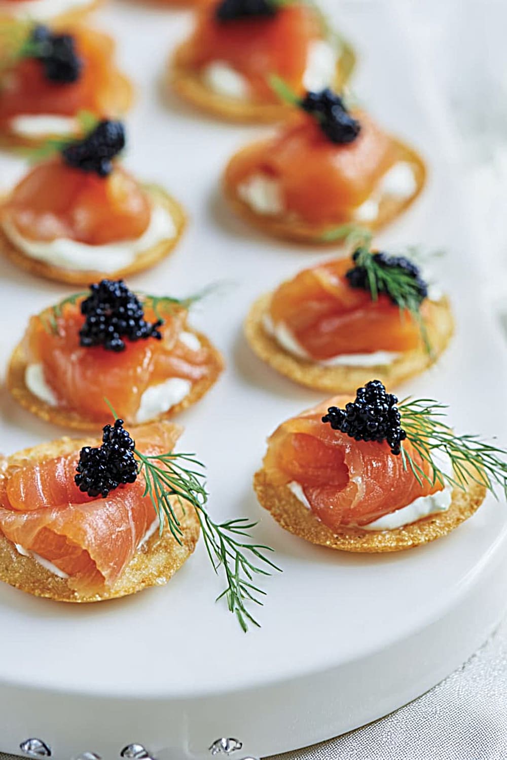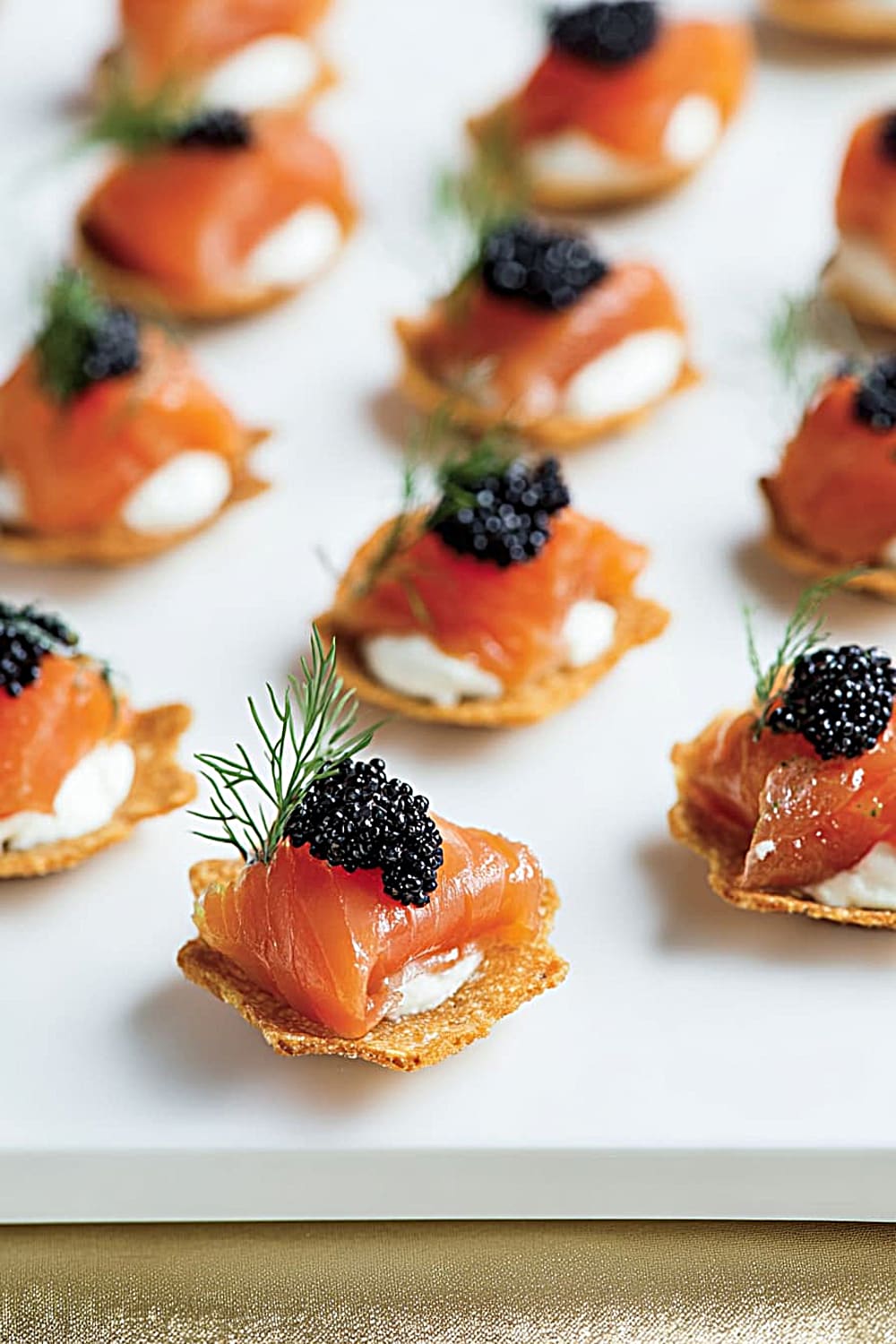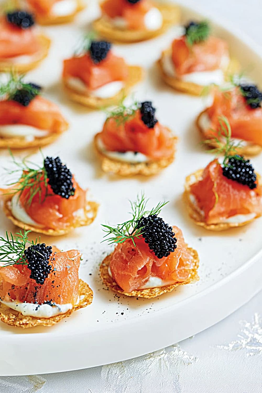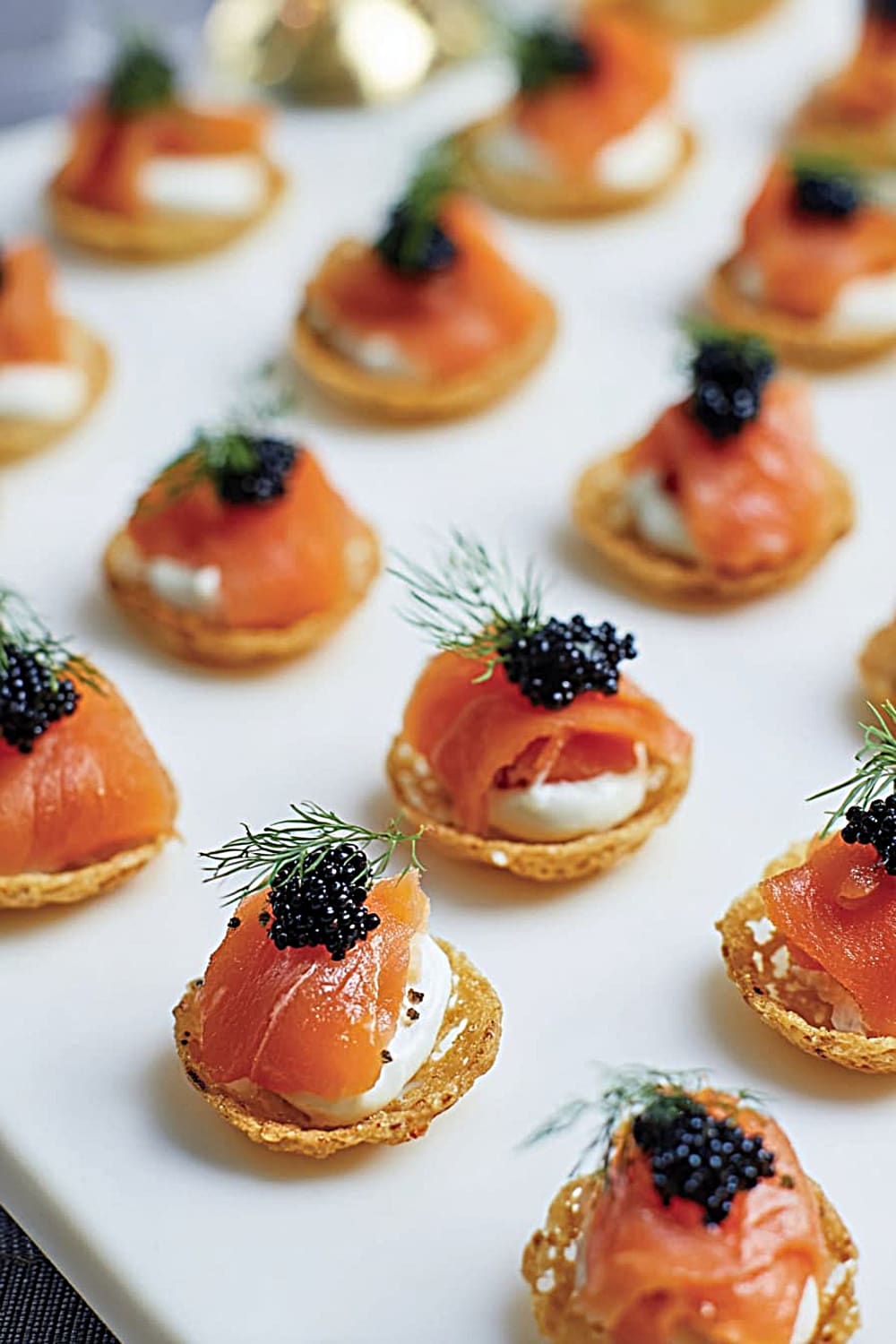 Build a Titanic-themed dinner party starting with these canapés, followed by beef Wellington or roasted duck as the main course. For brunch entertaining, serve alongside eggs Benedict, fresh fruit, and Danish pastries. Create a Scandinavian feast with Swedish meatballs, rye bread, and lingonberry sauce. New Year’s Eve menus shine with these canapés followed by rack of lamb and chocolate soufflé.