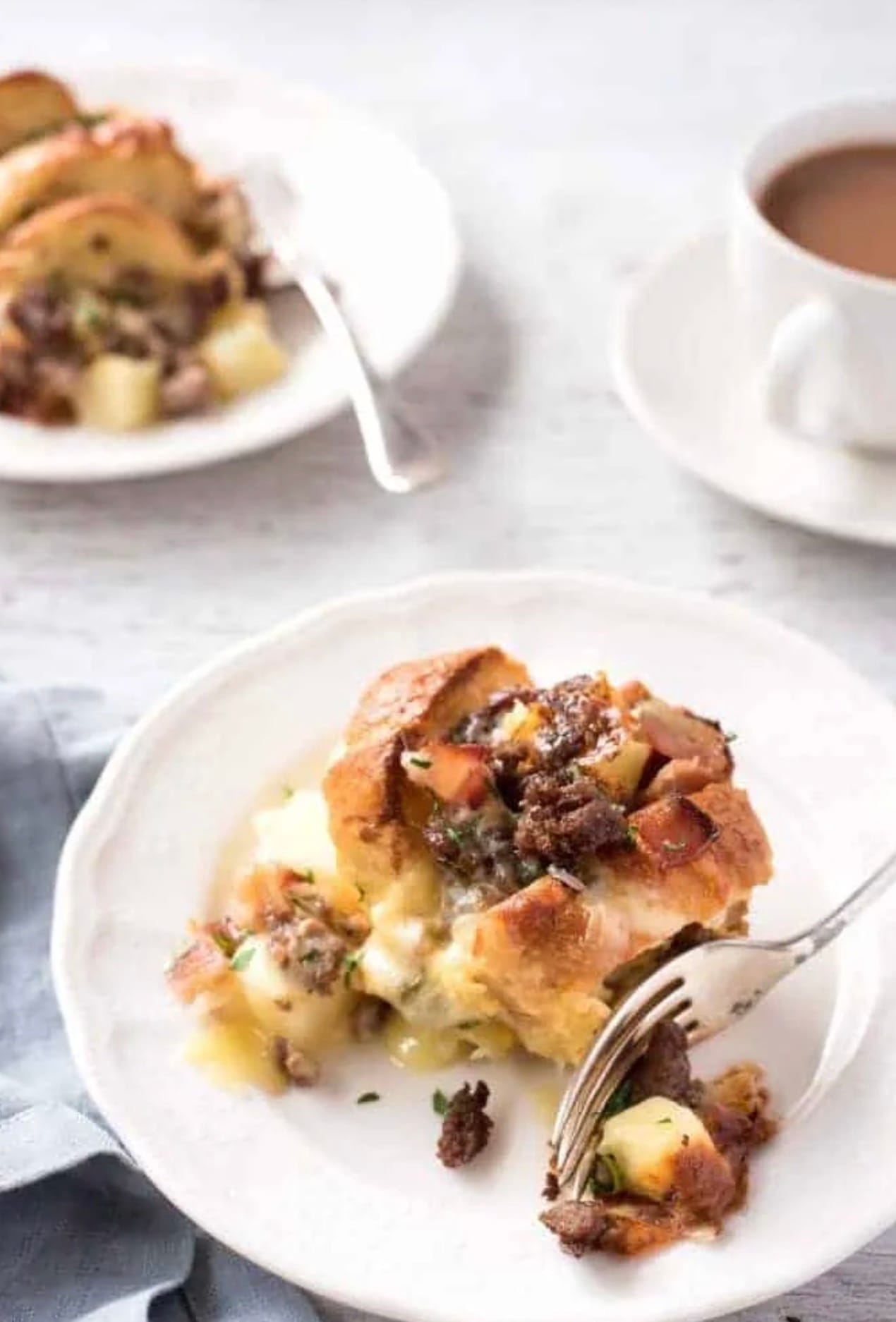Stand the soaked bread up in the dish. Add layers of potato, sausage, bacon, and cheese. Do this twice, ending with cheese on top. Pour the rest of the egg mix over everything.