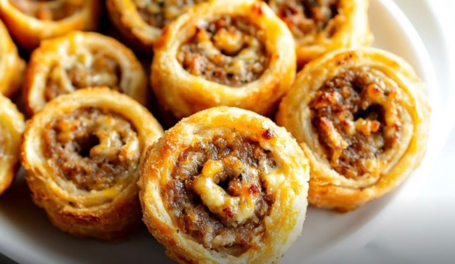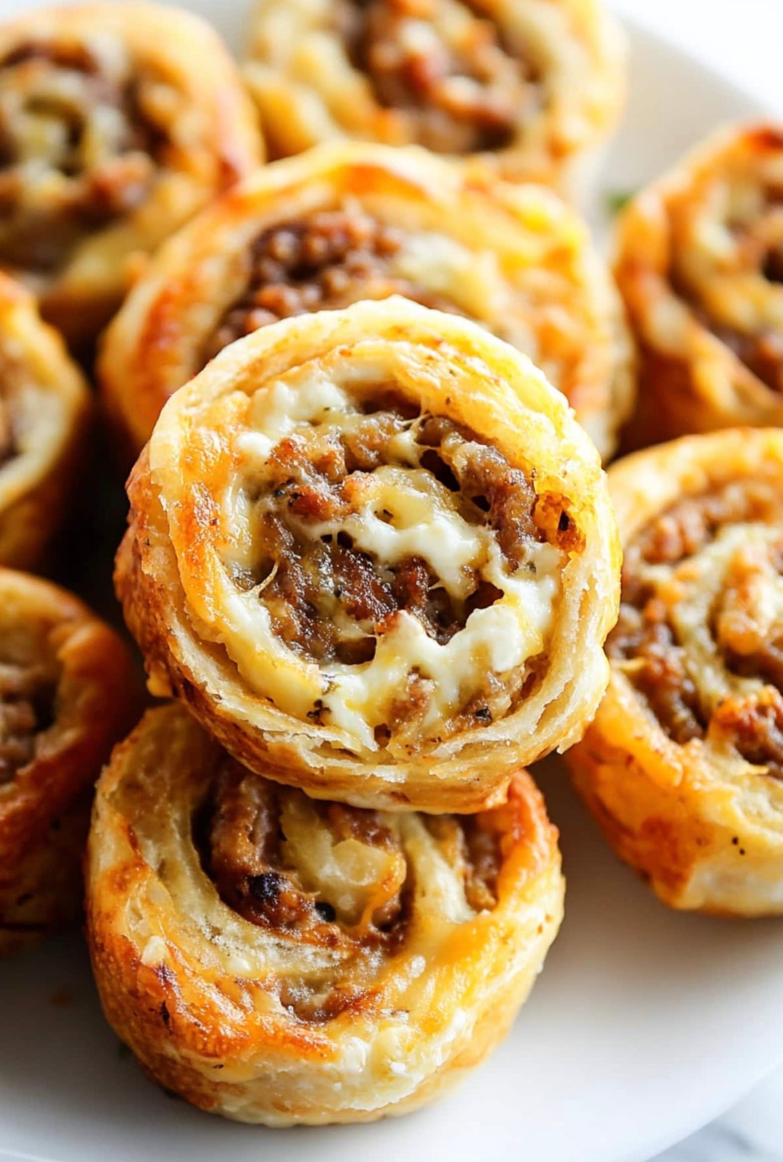 The recipe uses pork sausage, crescent rolls, cream cheese, and cheddar cheese. You’ll cook the sausage, then roll it up with the other ingredients in crescent roll dough. After chilling the rolls, you’ll slice and bake them until they’re golden brown. Your guests will love these cheesy, meaty bites!
