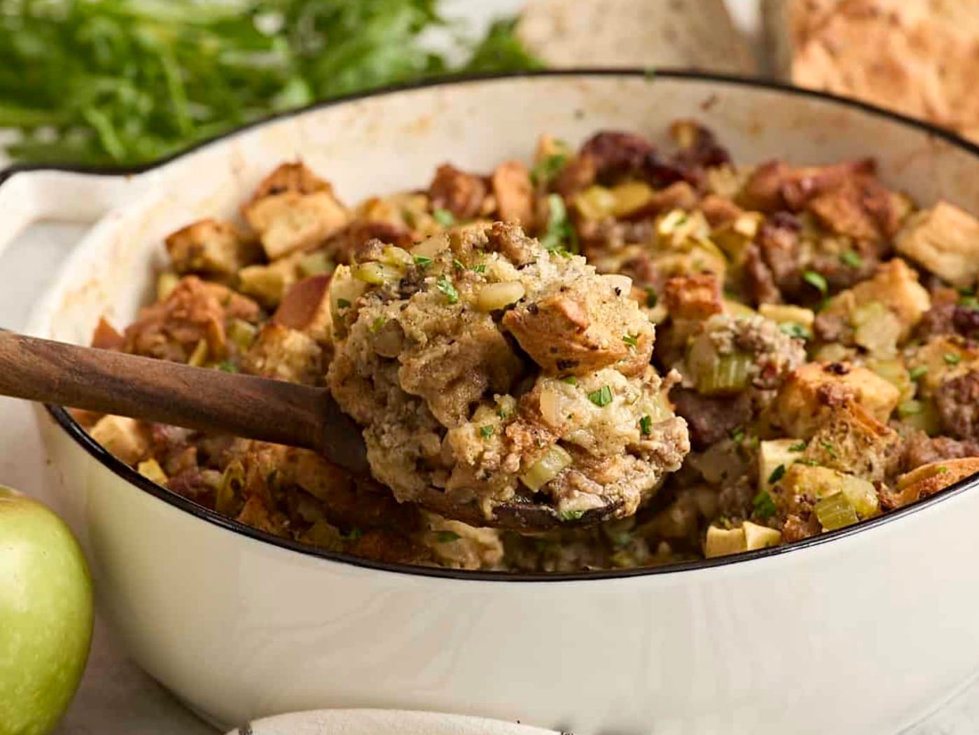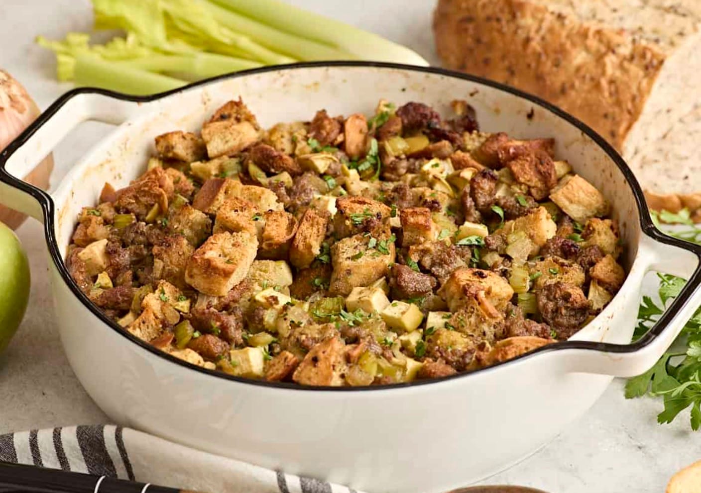 For a veggie-friendly stuffing, skip the sausage and add extra veggies like roasted squash or Brussels sprouts. Nuts like pecans or walnuts add a nice crunch too.