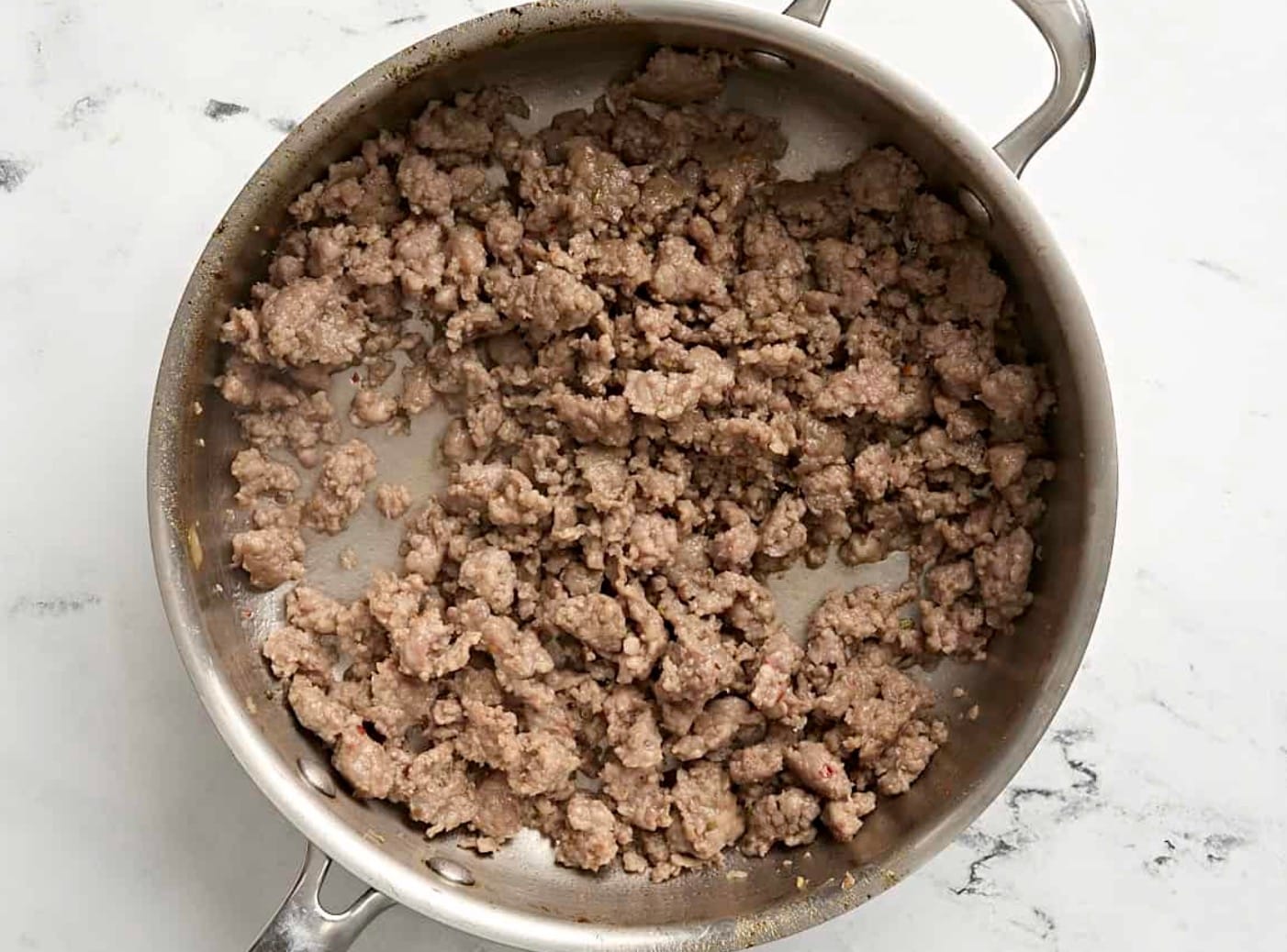In a large pan, cook 1 pound of mild Italian sausage over medium heat. Break it apart as it cooks until it’s nicely browned. Drain the extra fat and put the cooked sausage in a bowl.