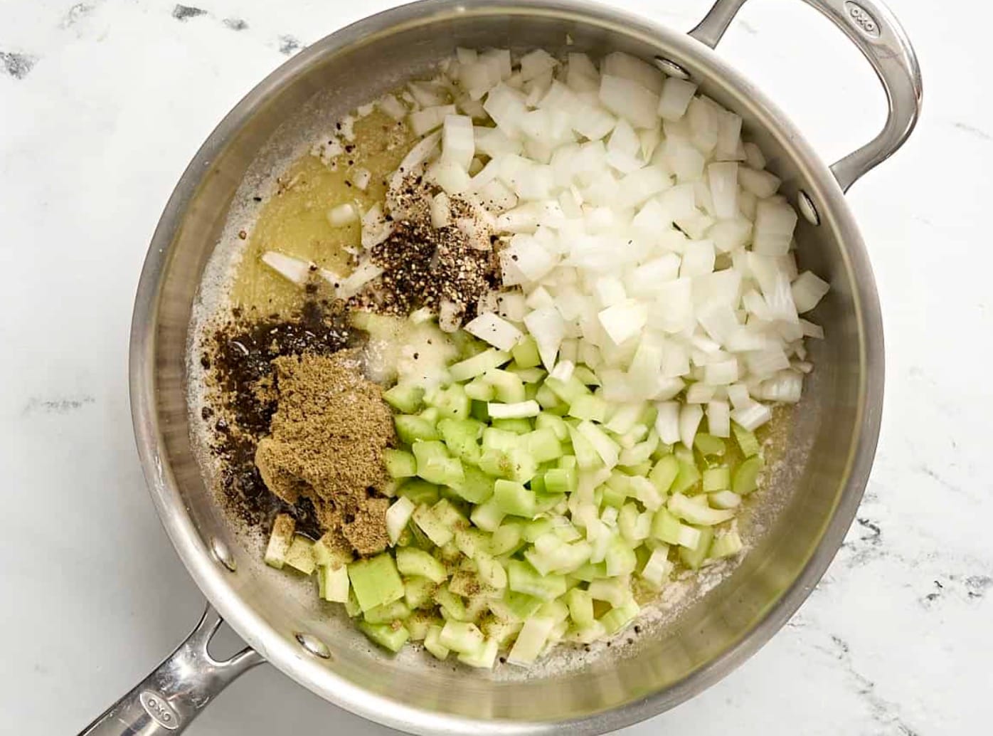 Clean out the pan and melt a stick of butter in it. Add 1 ½ cups each of diced onion and celery, 4 minced garlic cloves, 2 tablespoons of poultry seasoning, ½ teaspoon of salt, and 1 teaspoon of black pepper.