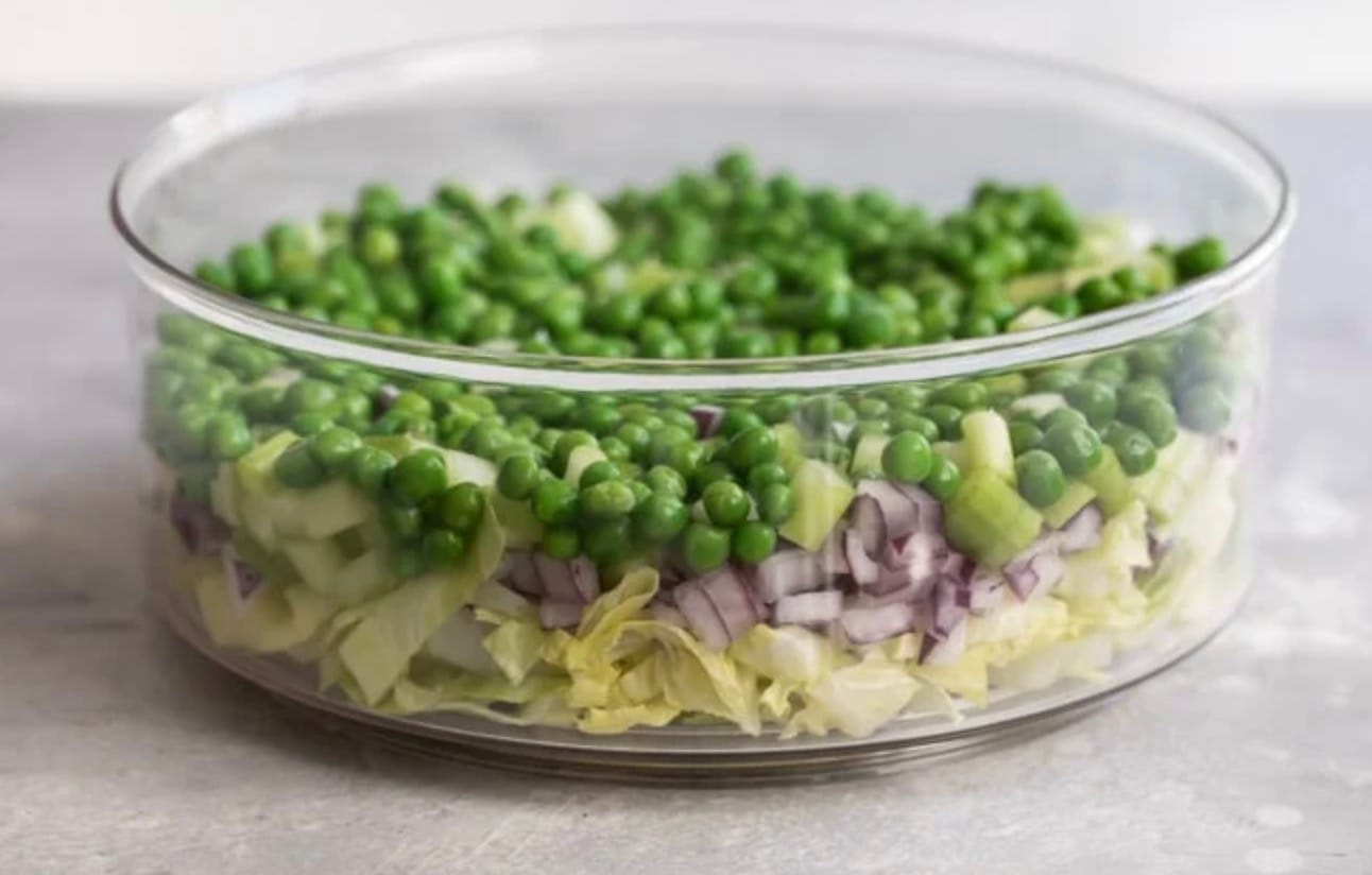 You’ll love how simple it is to put together. Just layer lettuce, onion, celery, and peas in a glass bowl. Top it with mayo, sugar, cheese, and bacon. Then chill it until you’re ready to serve. It’s a cool and crunchy treat that everyone will enjoy.