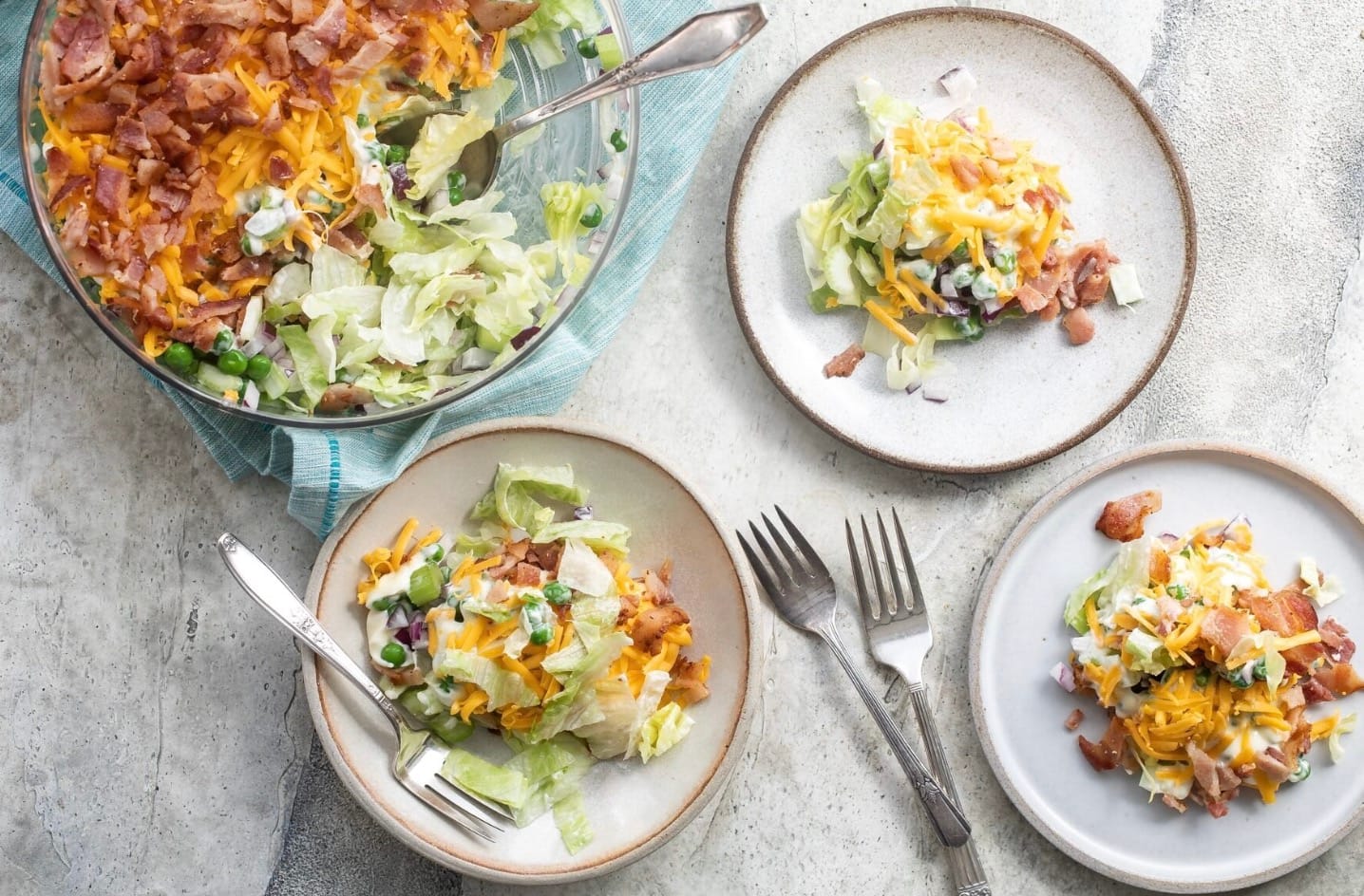 Don’t toss the salad before serving – let everyone dig in and mix their own portions. This keeps the layers looking nice and the bacon crispy.