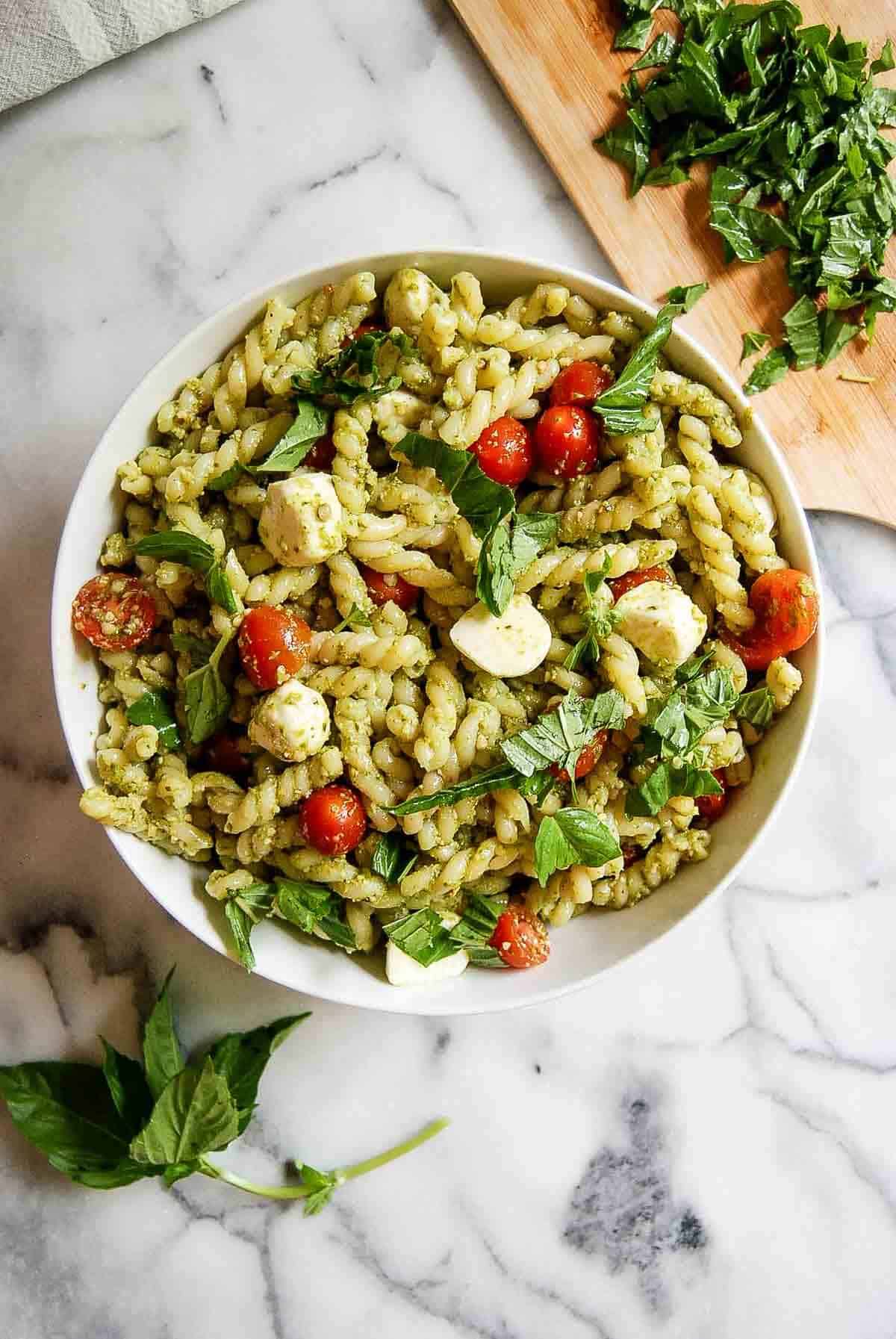 If the salad seems dry after storing, mix in a little extra pesto or a splash of olive oil before serving.