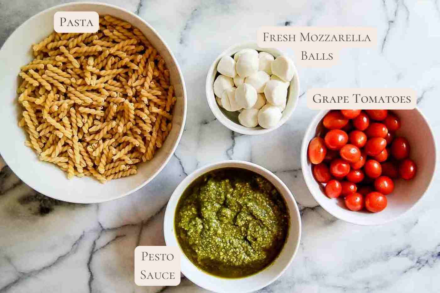 Add the basil pesto sauce, sliced grape tomatoes, and sliced mozzarella balls.