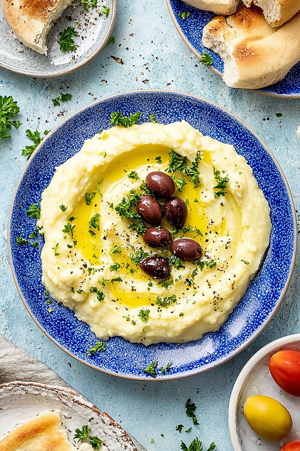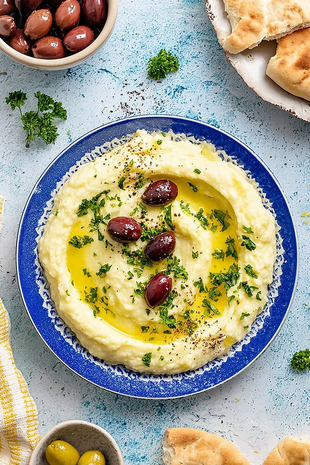 - 8 To serve, spread the skordalia onto a serving plate using the back of a spoon to create attractive swirls and valleys. Drizzle generously with extra olive oil, sprinkle with fresh chopped herbs, and arrange olives around the edges. Serve with warm pita or flatbread for the ultimate Mediterranean experience.
