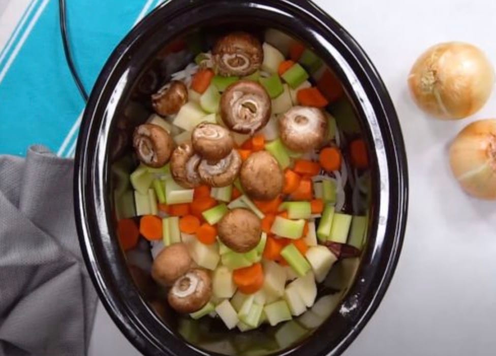 Add the sliced onions, potato chunks, carrot pieces, celery, and whole mushrooms to the slow cooker.