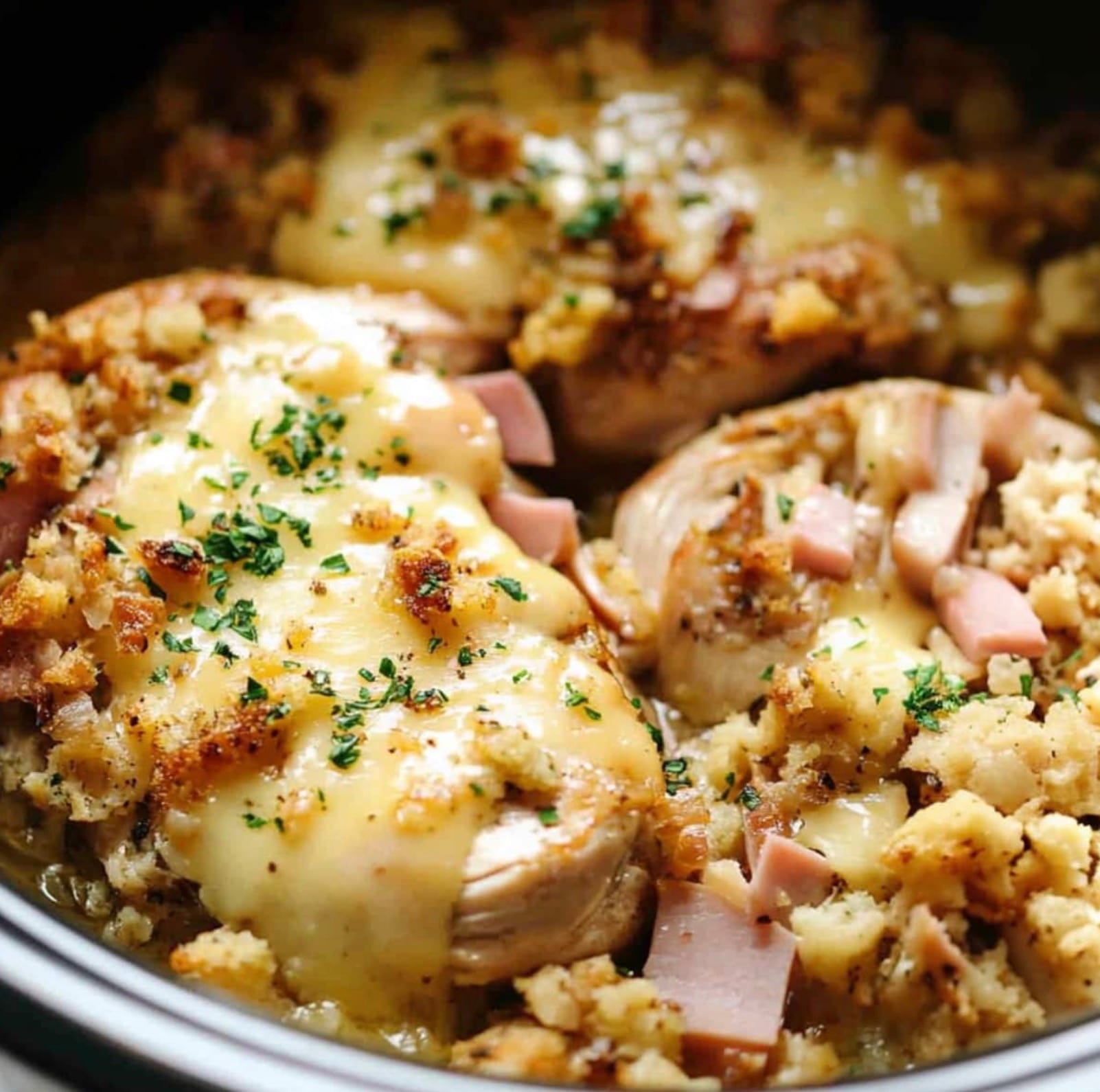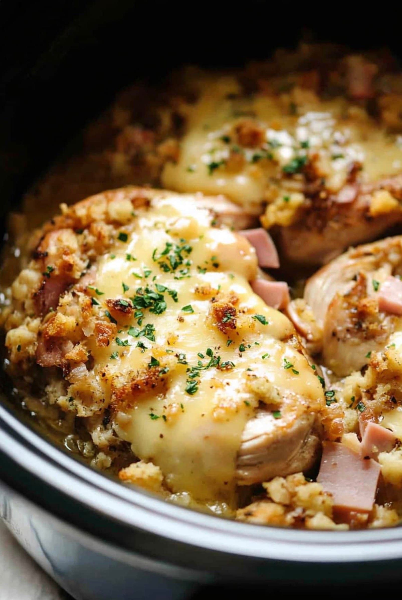 Are you looking for an easy and tasty dinner that will impress your family? Try this slow cooker chicken cordon bleu recipe! You can make a delicious meal with only 10 minutes of prep time and 5 hours of cooking. This dish has tender chicken, savory ham, and melty Swiss cheese in a creamy sauce.