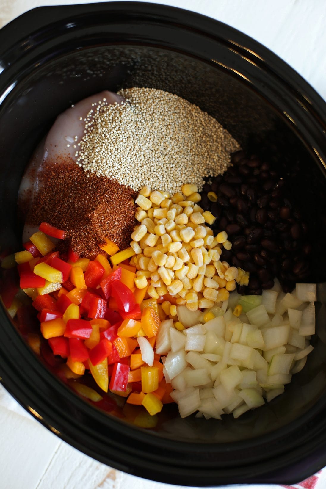 - In a medium-sized bowl, mix together the corn, black beans, chicken broth, salsa, cream of chicken soup, cumin, and chili powder. Pour this mixture over the chicken and vegetables in the slow cooker.