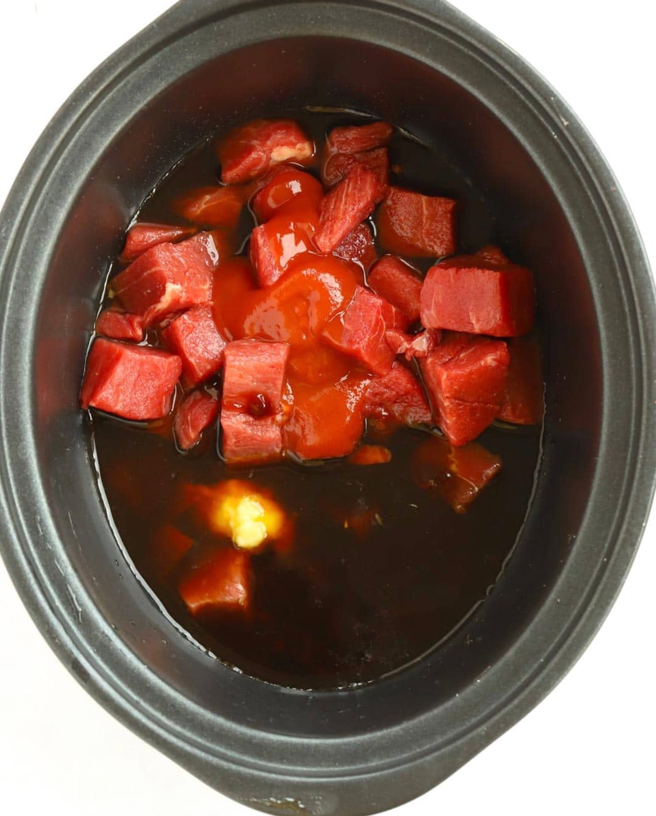 Start by gathering all your ingredients. Put the diced beef, crushed garlic, and grated ginger in your slow cooker. Add the soy sauce, oyster sauce, honey, and ketchup. Pour in 150ml of water and mix well.