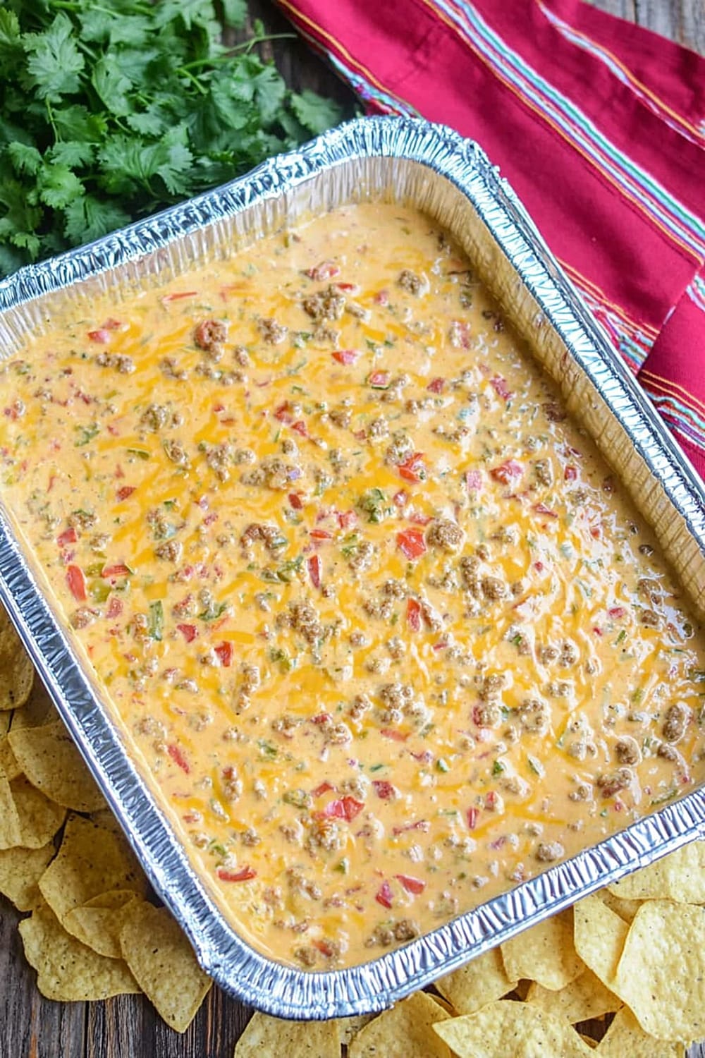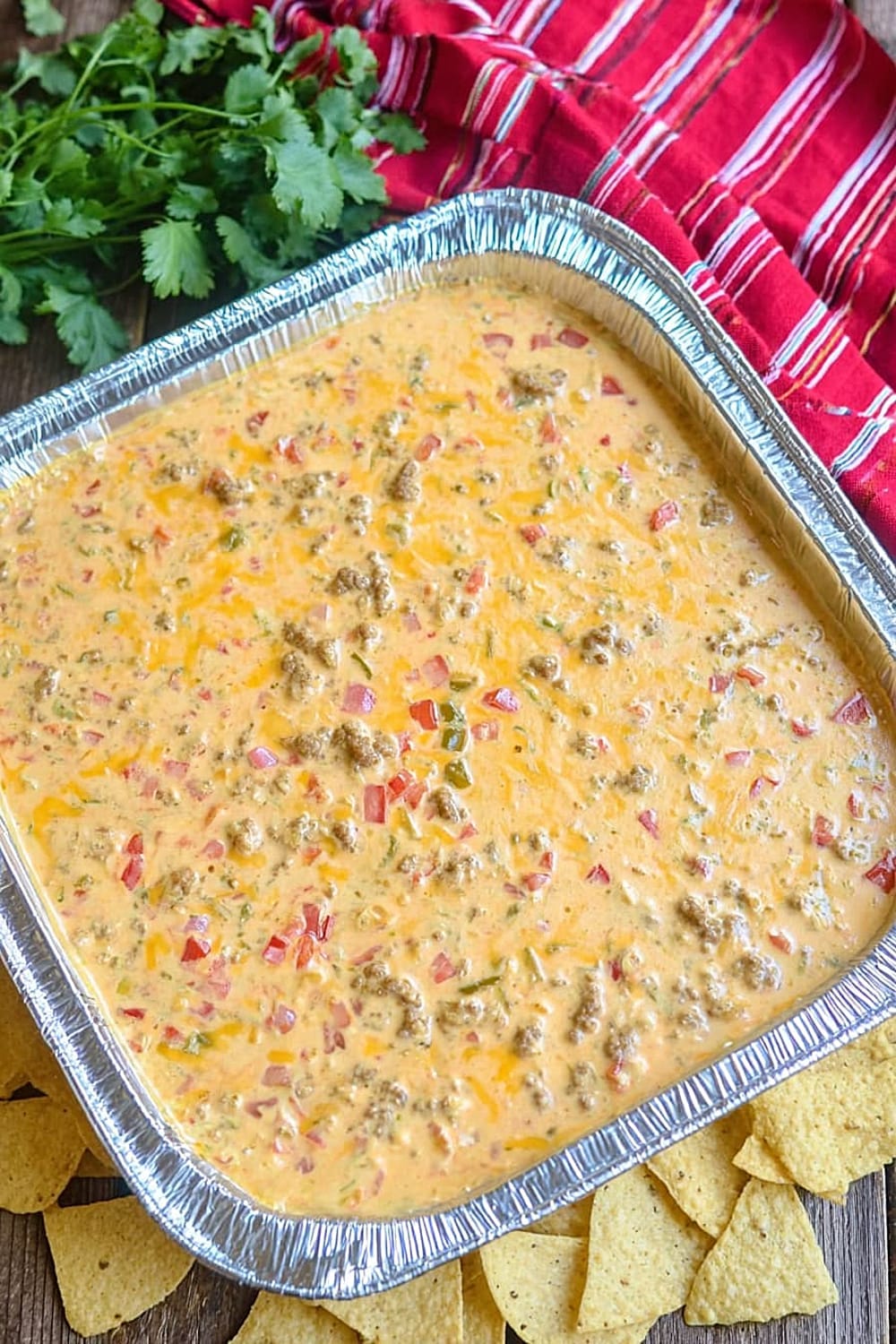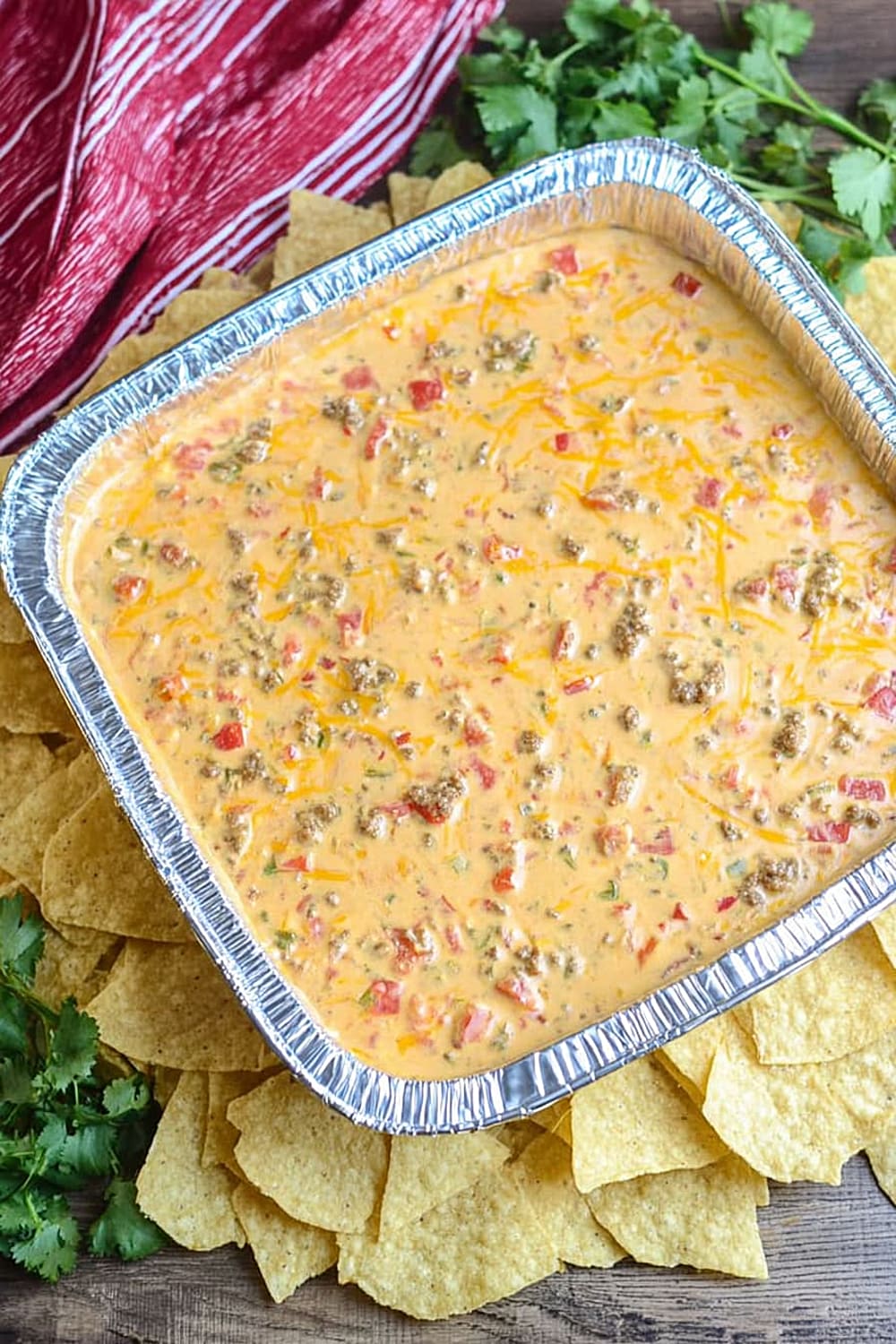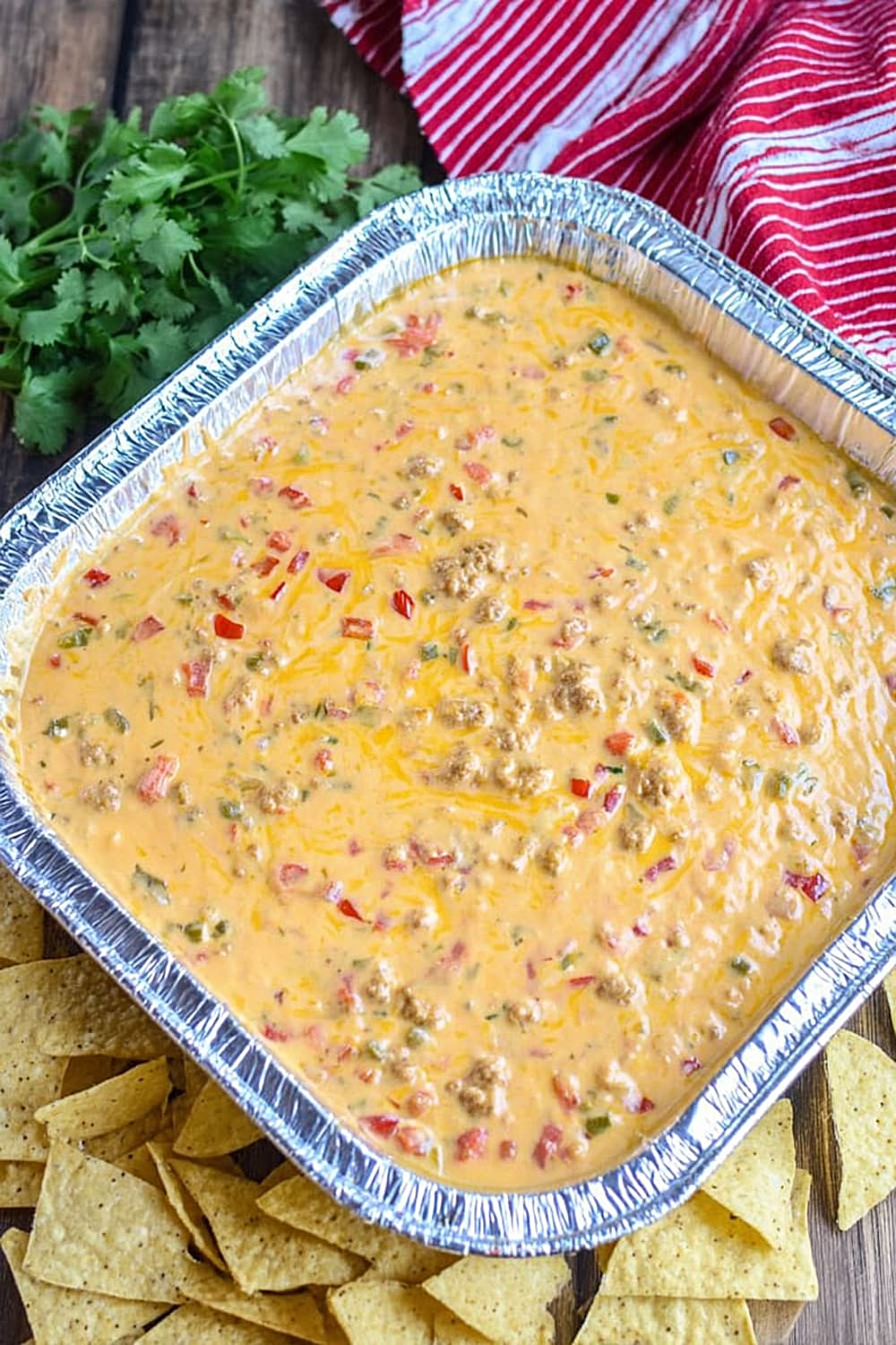Build a backyard barbecue around this queso with smoked brisket, pulled pork, and grilled chicken as main courses. Add coleslaw, potato salad, and cornbread for classic barbecue sides. For game day, pair with buffalo chicken dip, loaded nachos, and mini sliders for the ultimate comfort food spread.