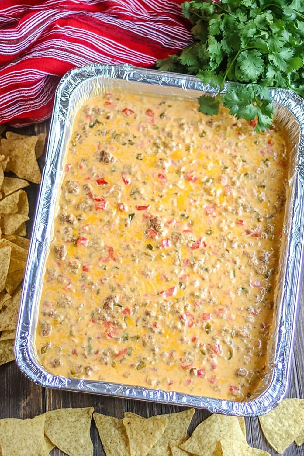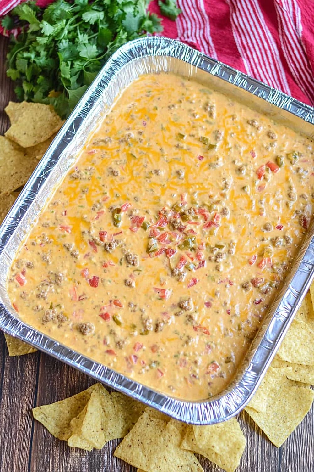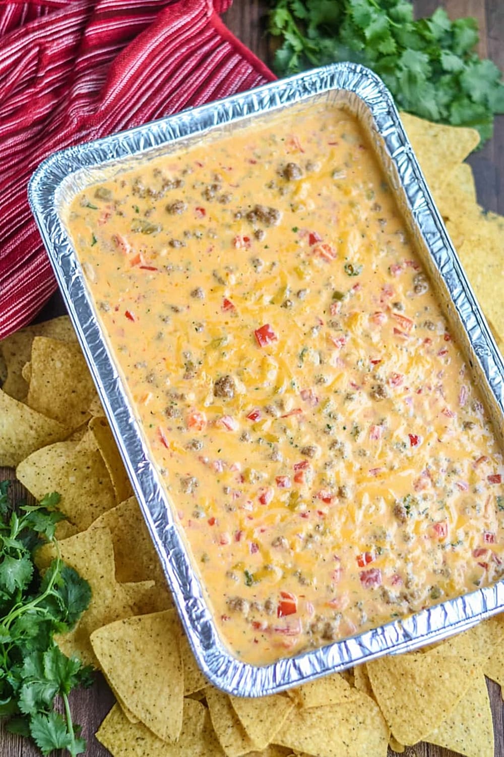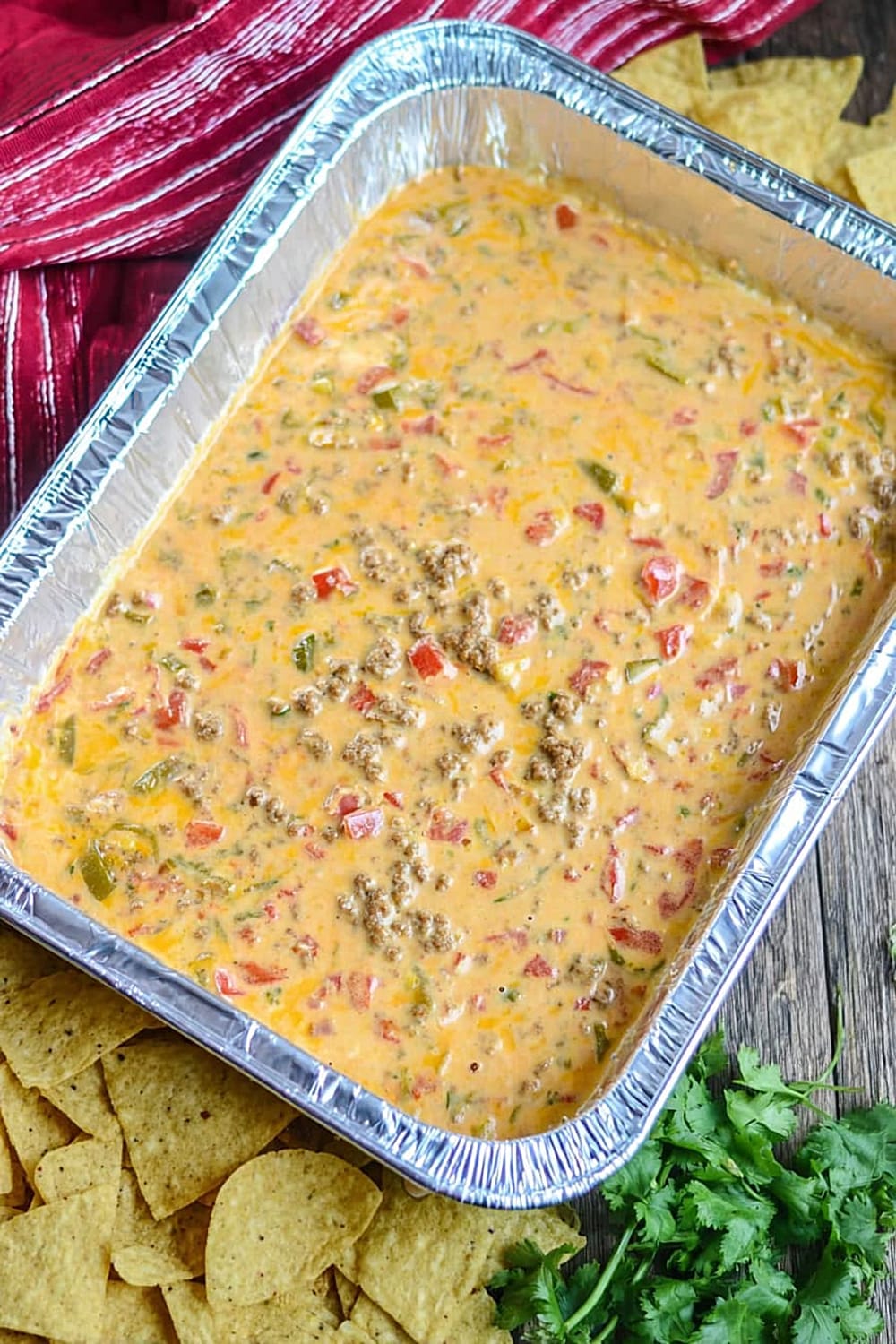 Build a backyard barbecue around this queso with smoked brisket, pulled pork, and grilled chicken as main courses. Add coleslaw, potato salad, and cornbread for classic barbecue sides. For game day, pair with buffalo chicken dip, loaded nachos, and mini sliders for the ultimate comfort food spread.