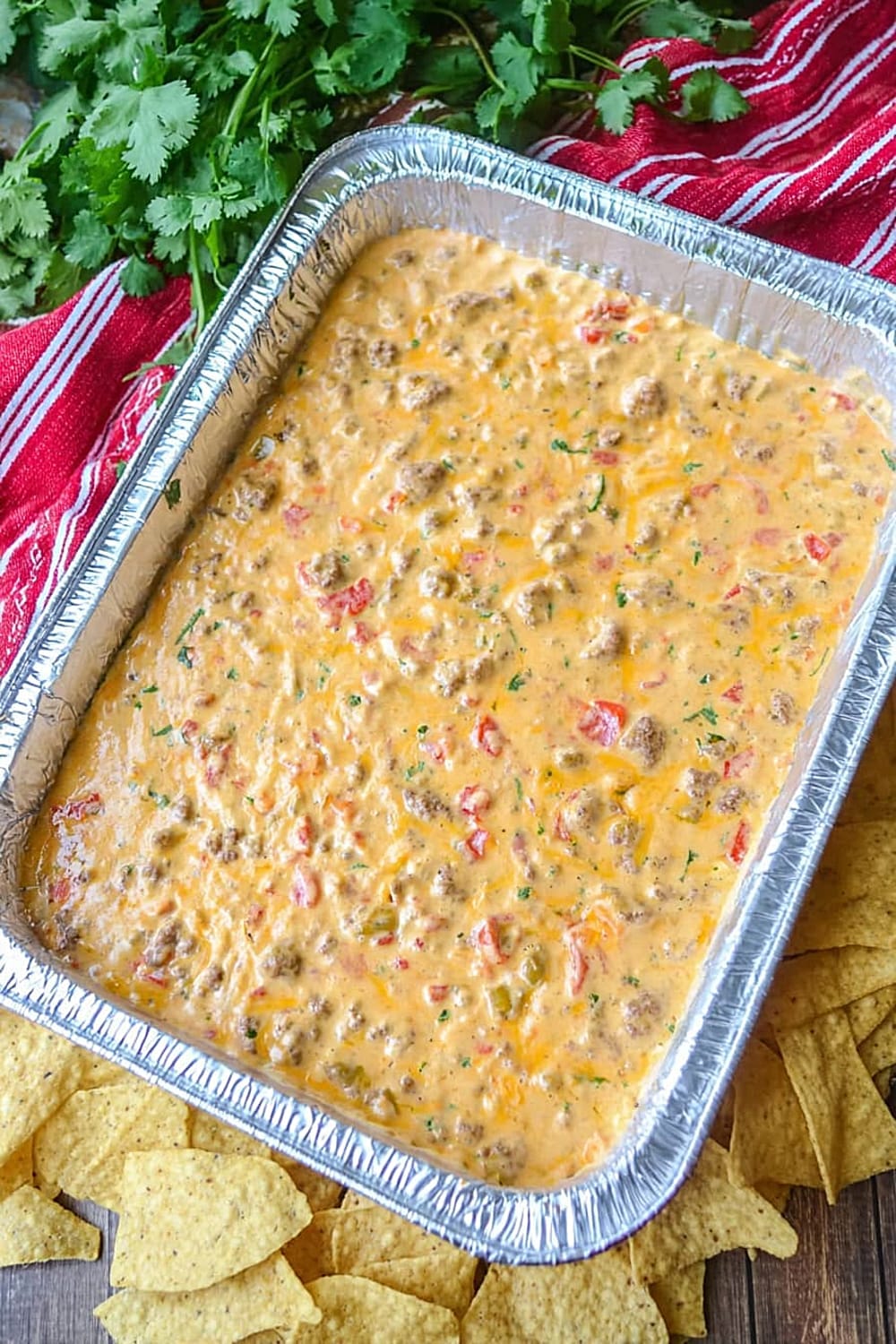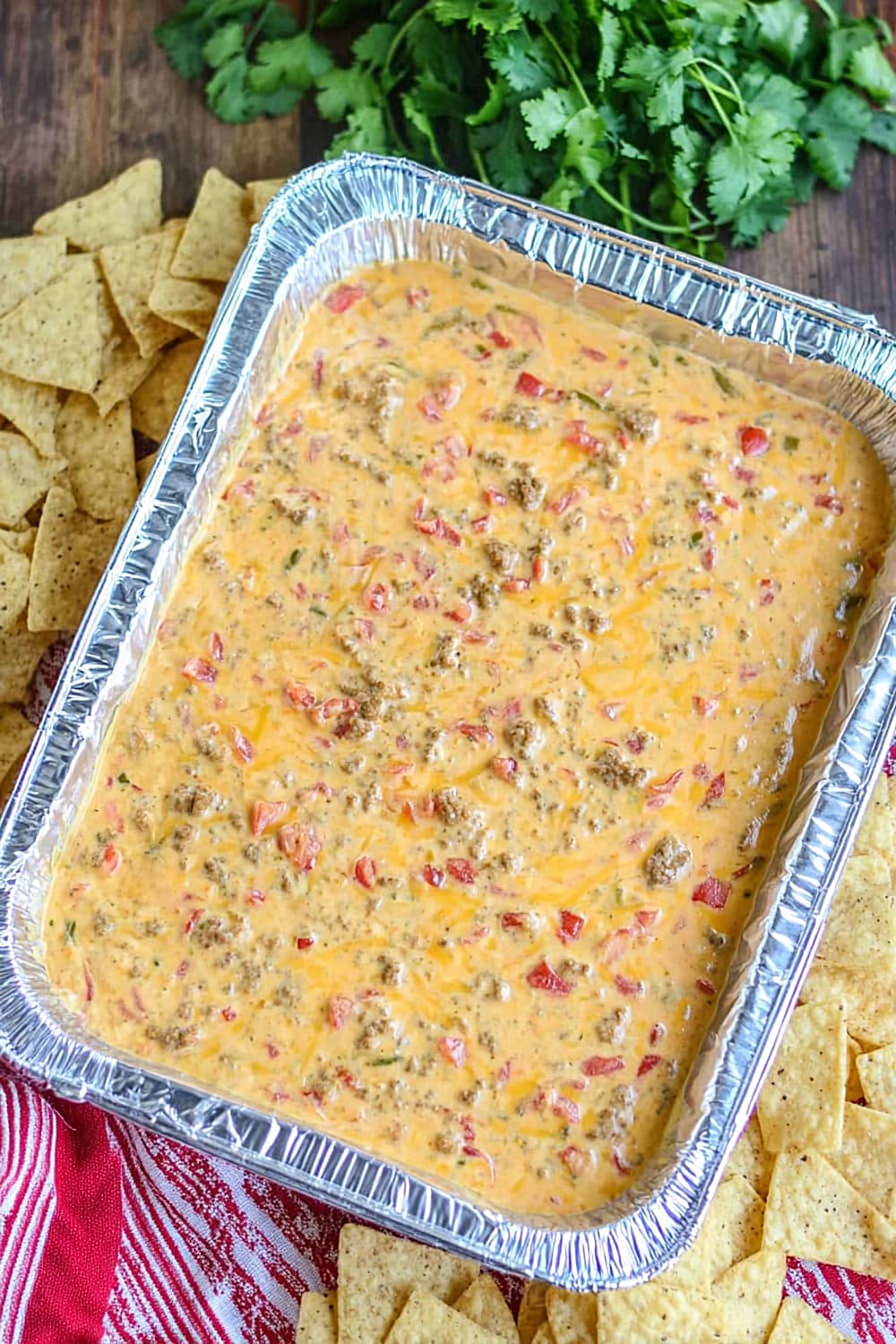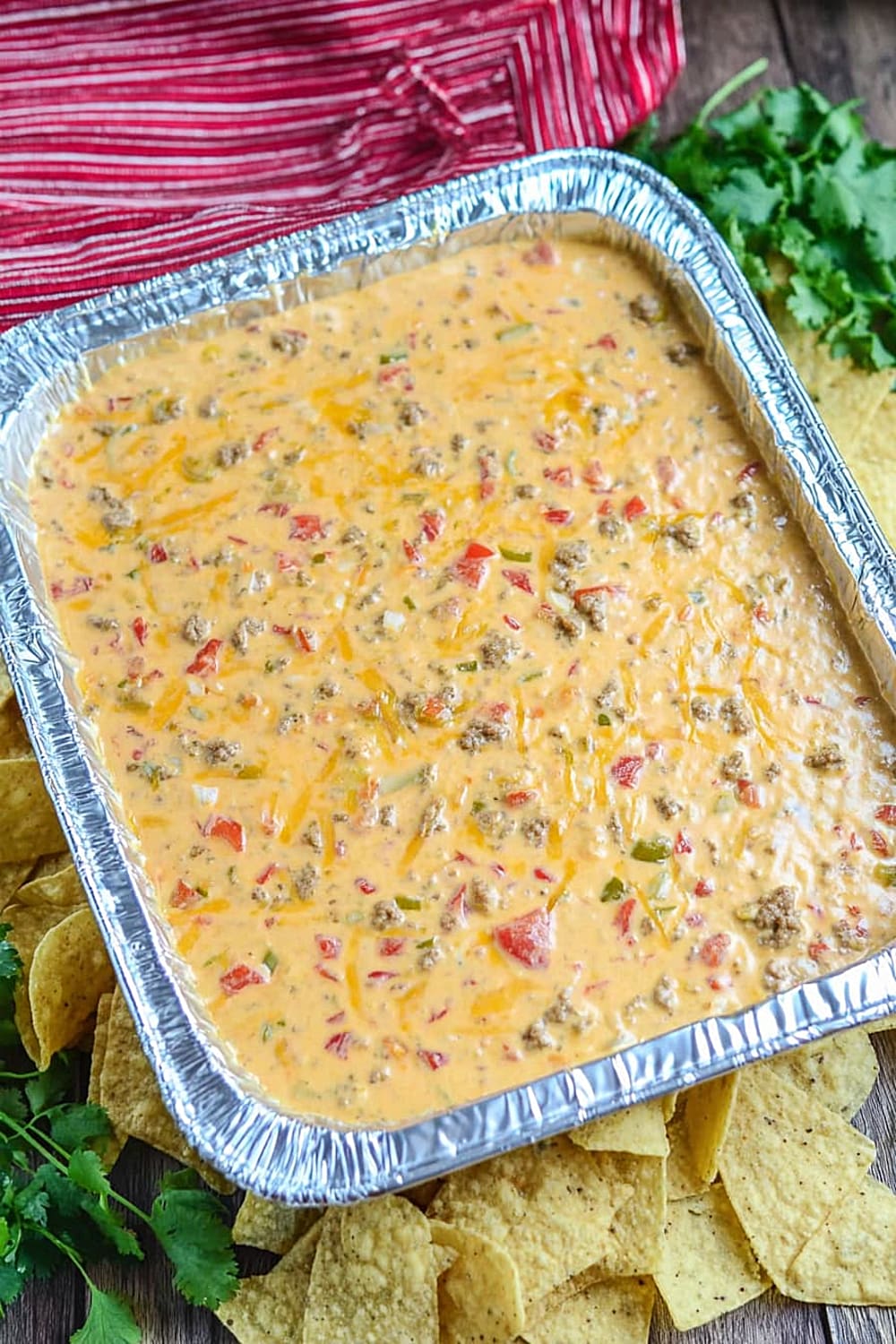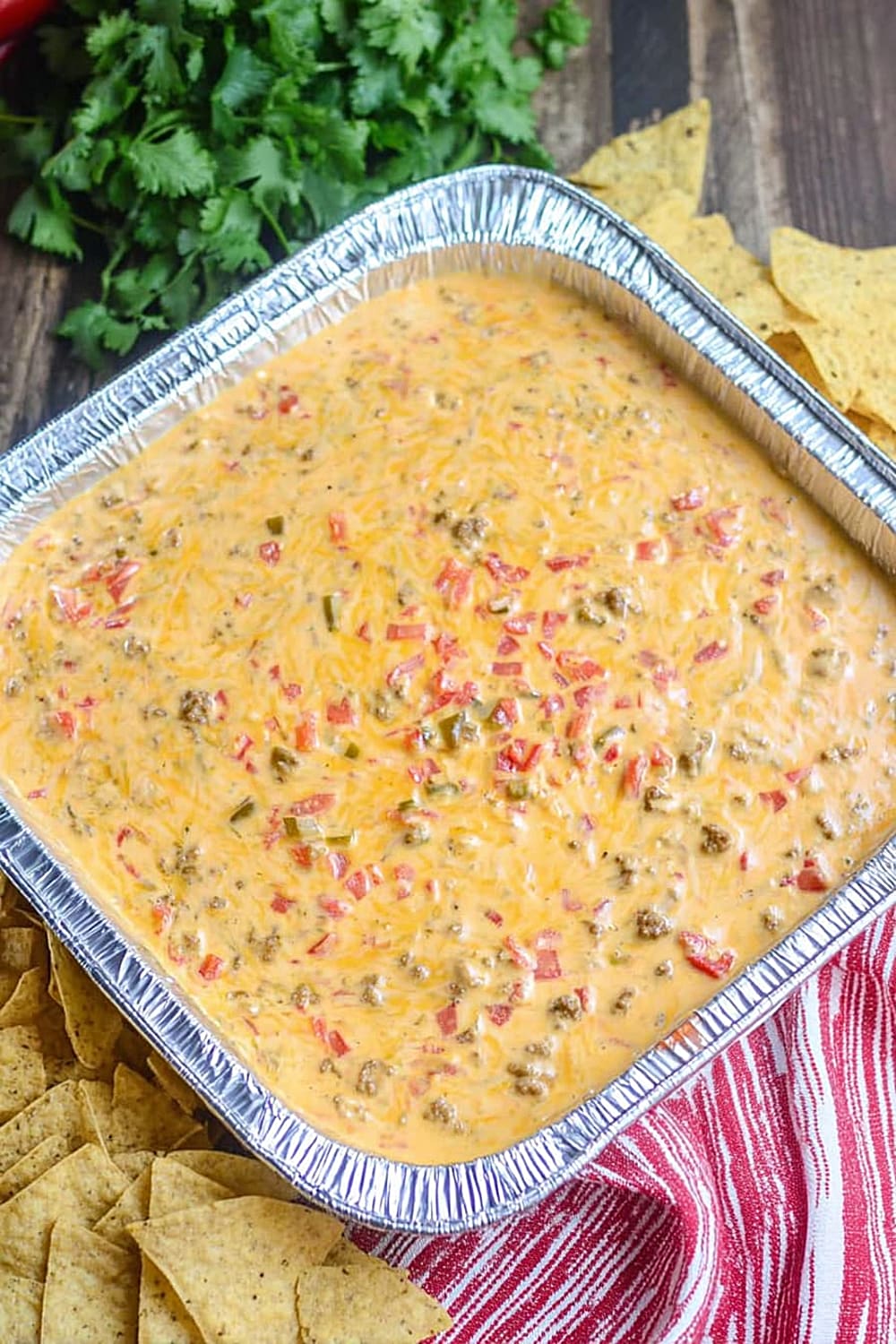 Build a backyard barbecue around this queso with smoked brisket, pulled pork, and grilled chicken as main courses. Add coleslaw, potato salad, and cornbread for classic barbecue sides. For game day, pair with buffalo chicken dip, loaded nachos, and mini sliders for the ultimate comfort food spread.