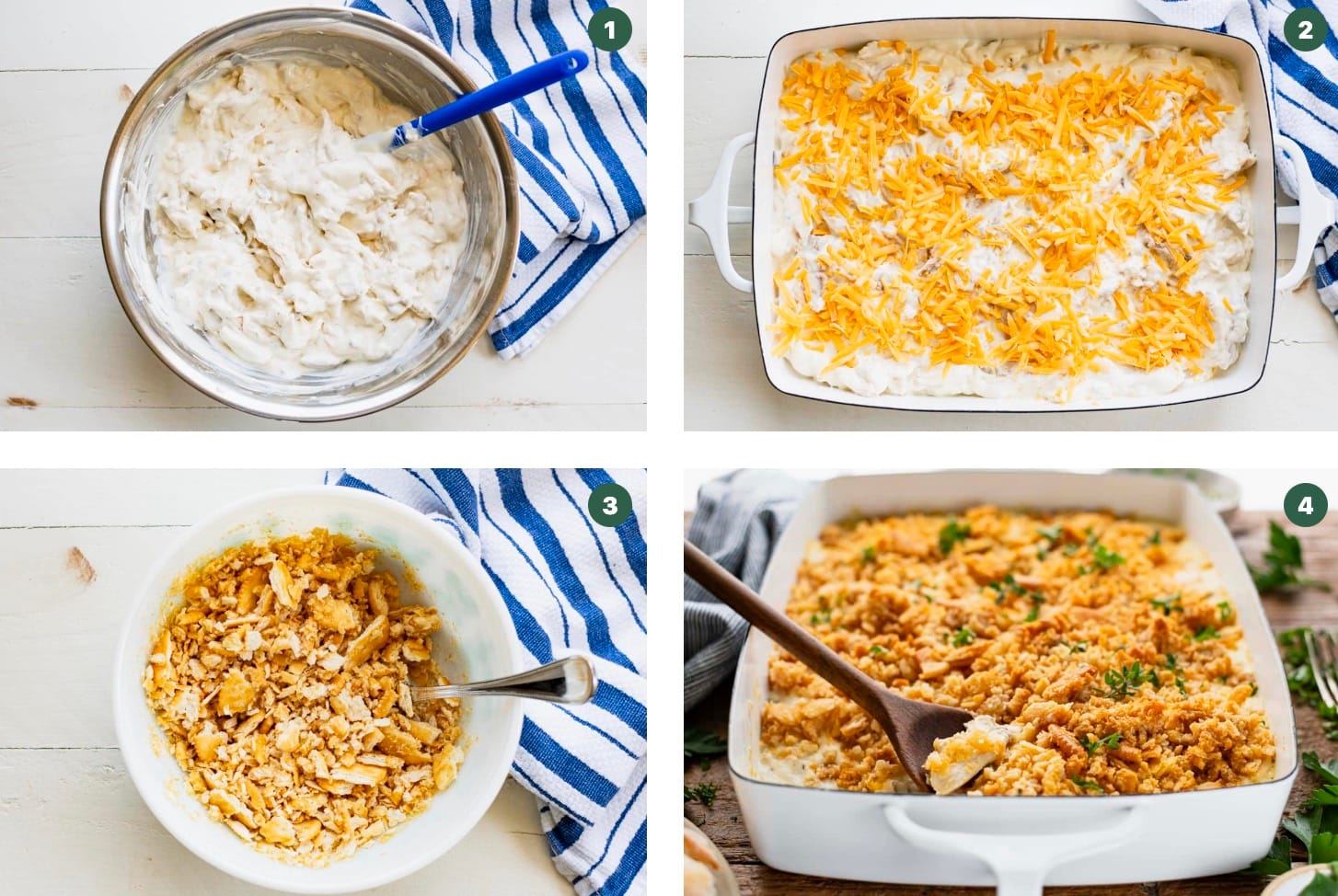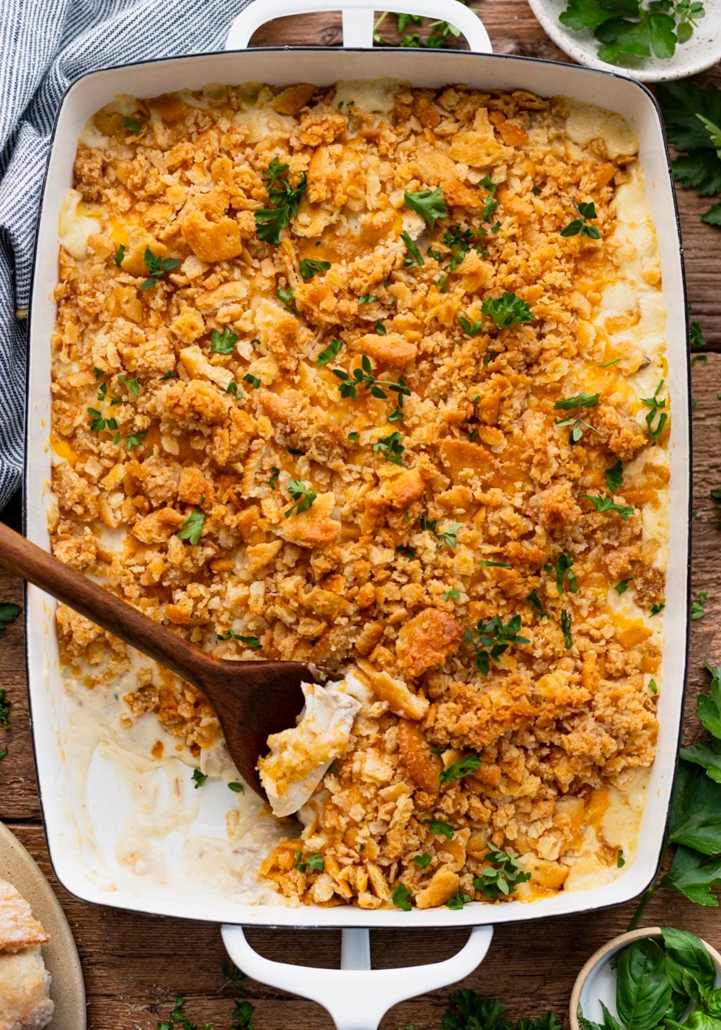 Your casserole is done when it’s hot and bubbly, the cheese is melted, and the crackers are golden brown.