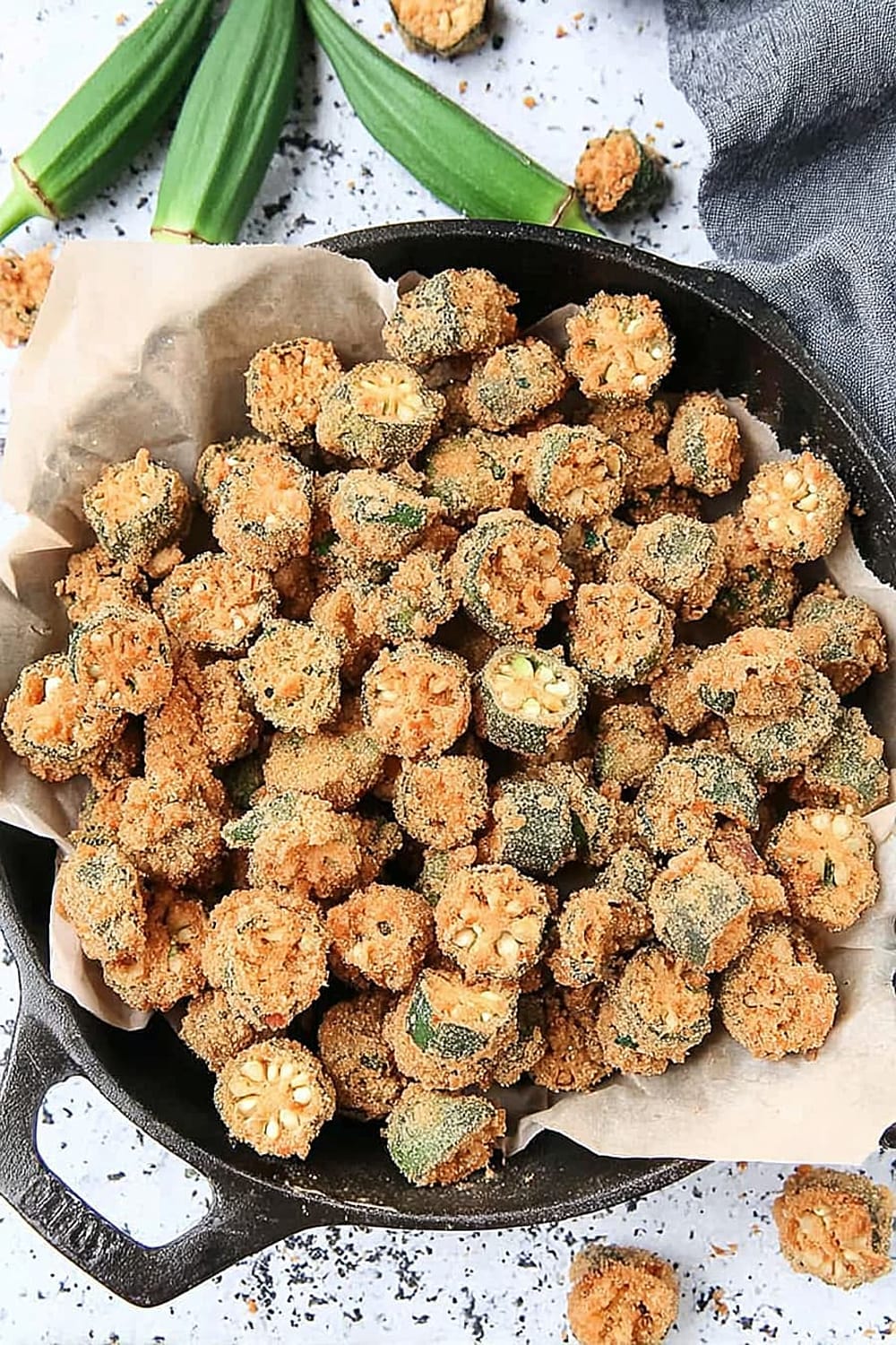 - Wire cooling rack – Place over paper towels for superior draining and to keep fried okra crispy longer