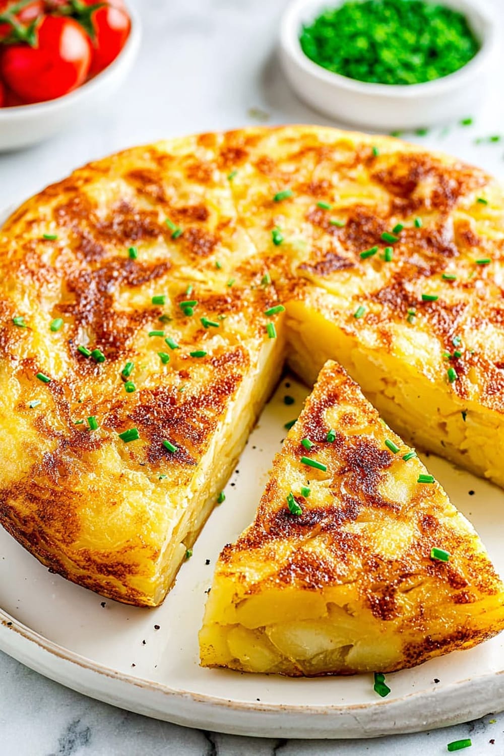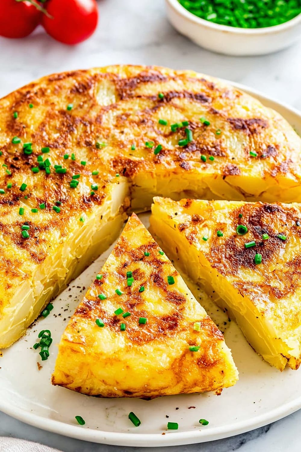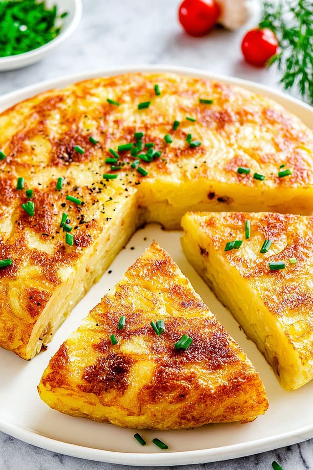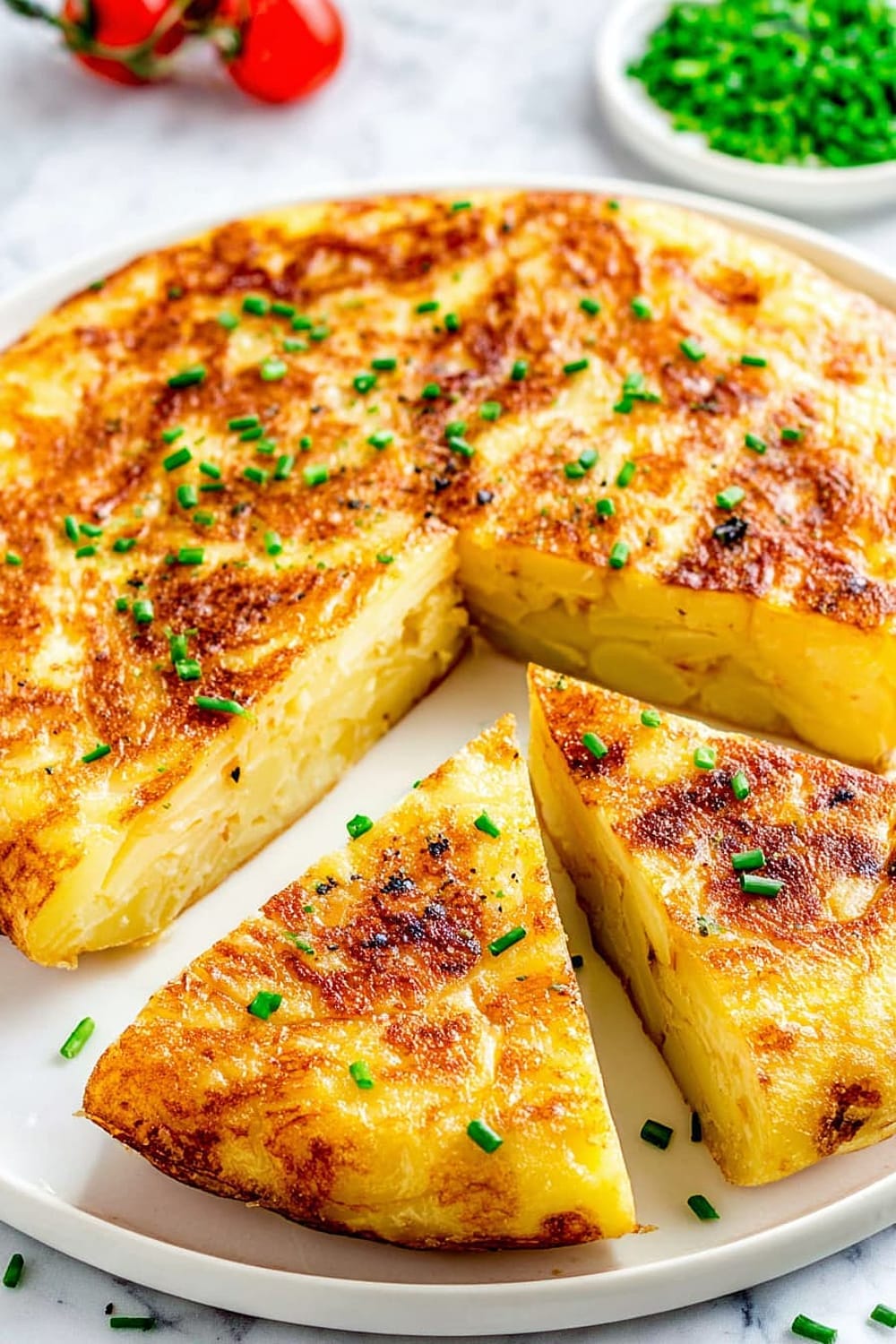 - 9 Remove from heat and either slide the tortilla directly onto a serving plate or repeat the plate-flipping technique for a perfect presentation. Garnish with chopped chives and let rest for 2-3 minutes before slicing. Cut into wedges like a pie and serve warm or at room temperature.