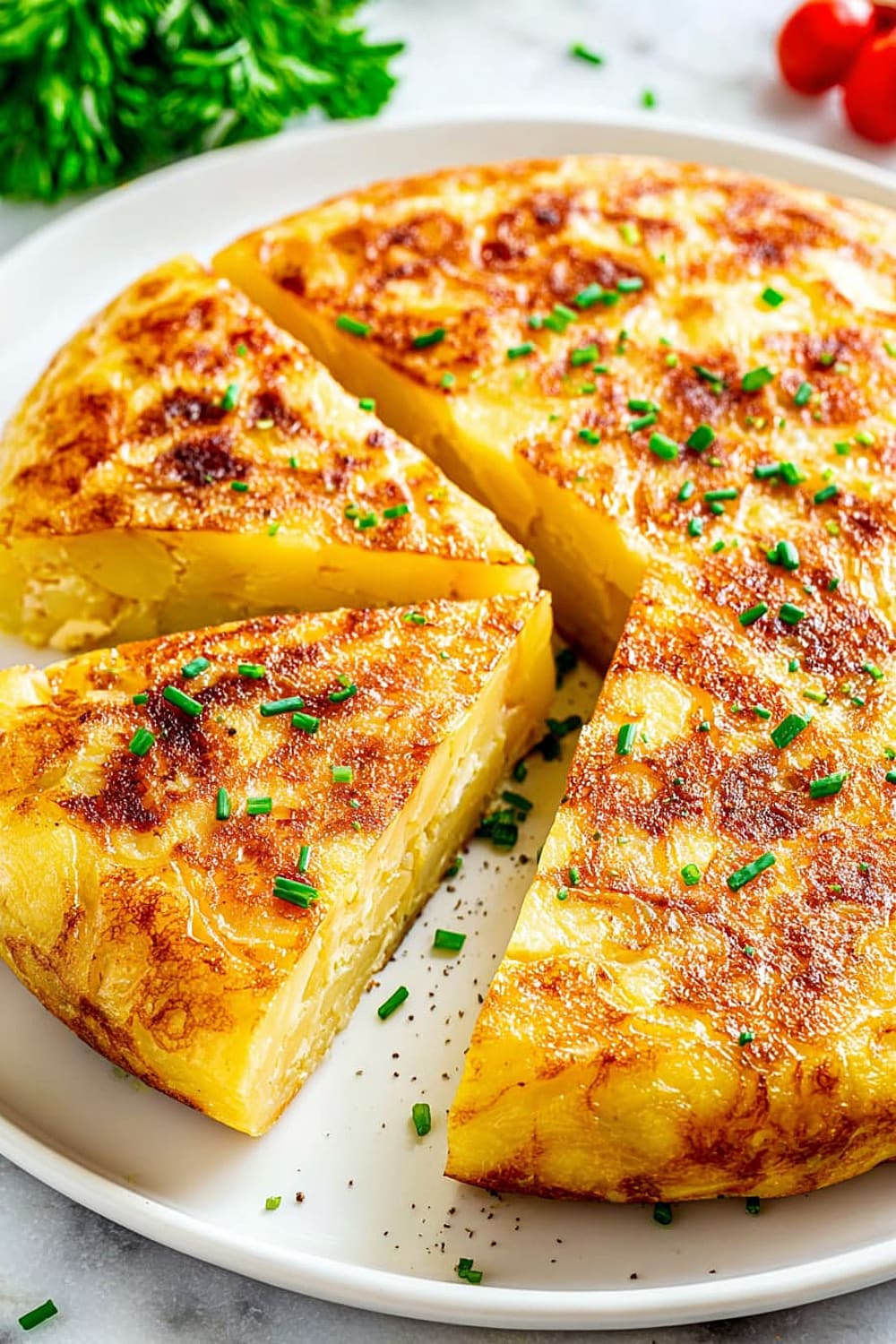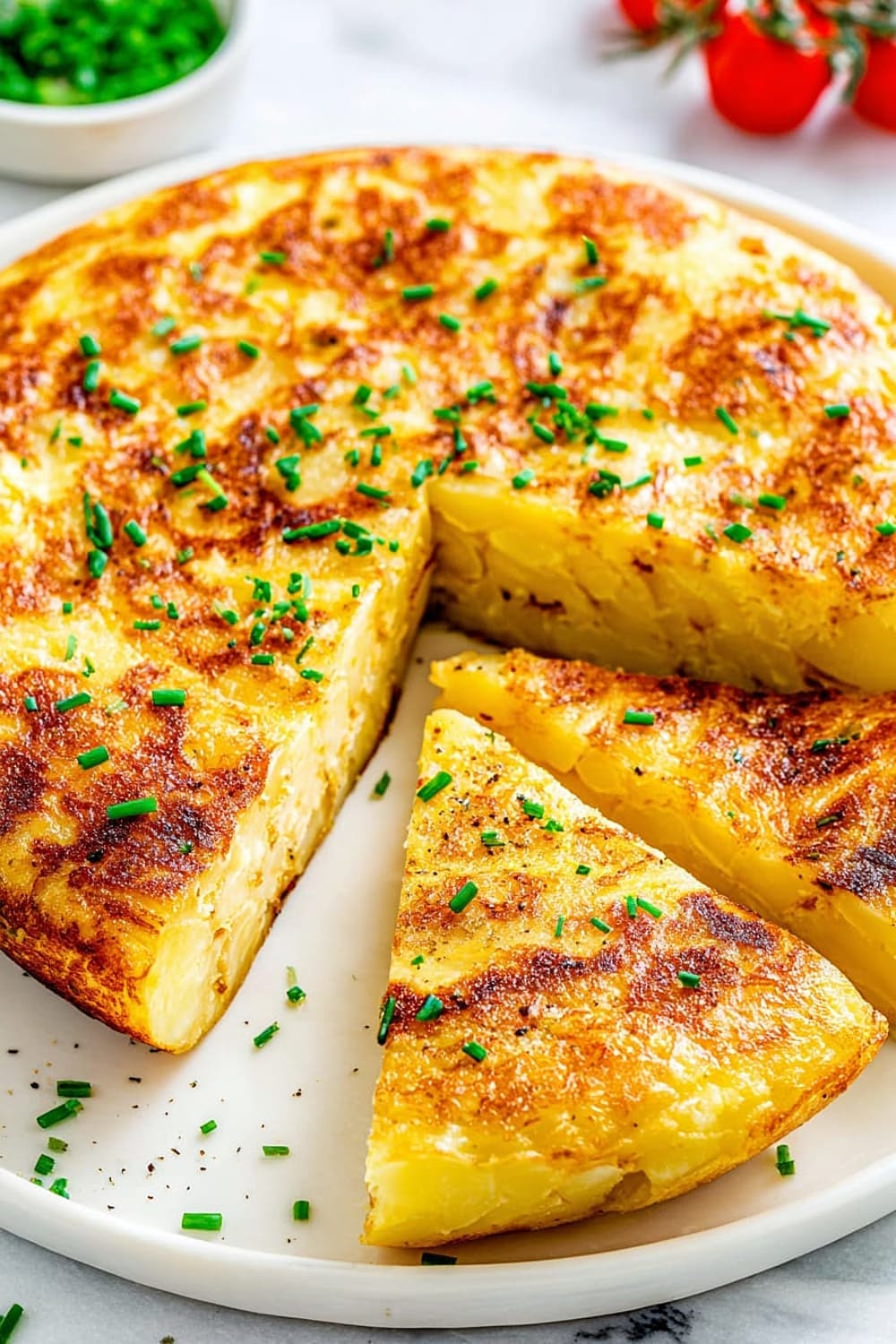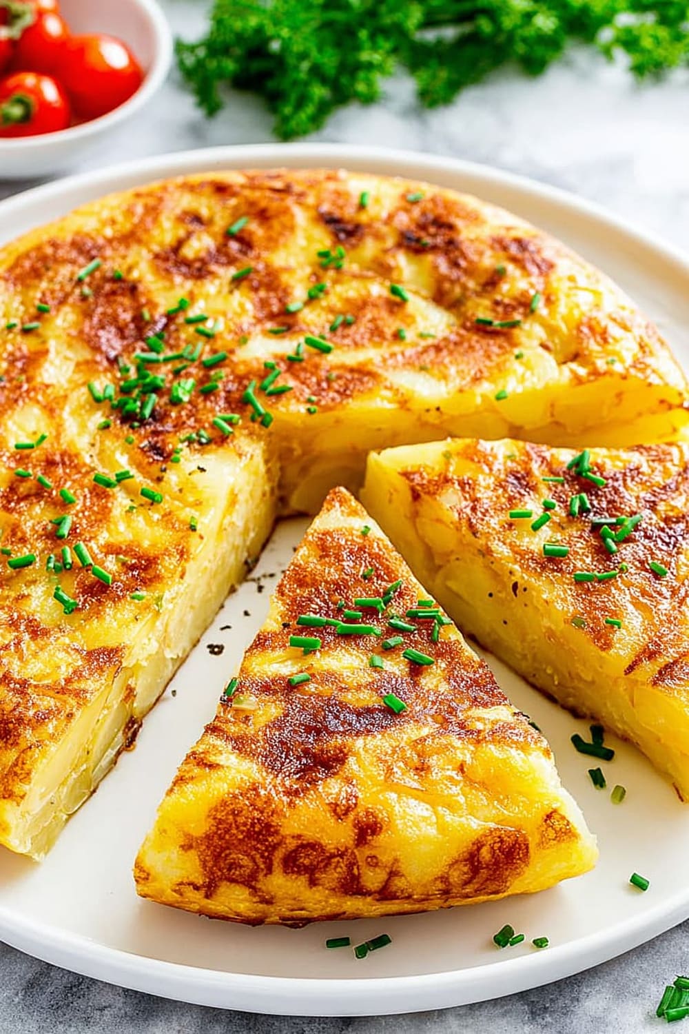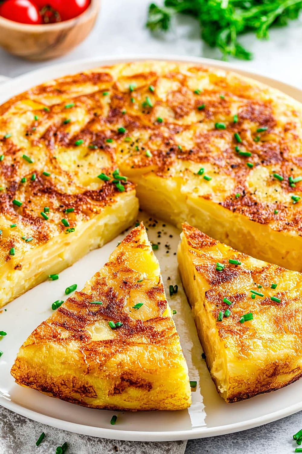 - 9 Remove from heat and either slide the tortilla directly onto a serving plate or repeat the plate-flipping technique for a perfect presentation. Garnish with chopped chives and let rest for 2-3 minutes before slicing. Cut into wedges like a pie and serve warm or at room temperature.