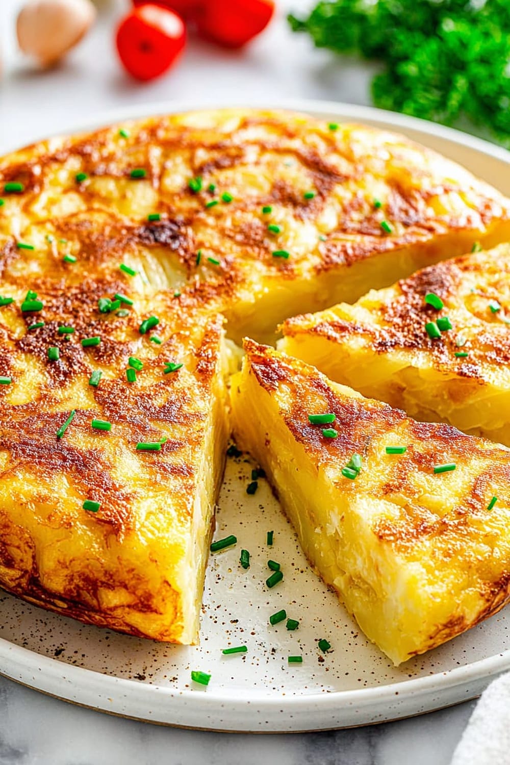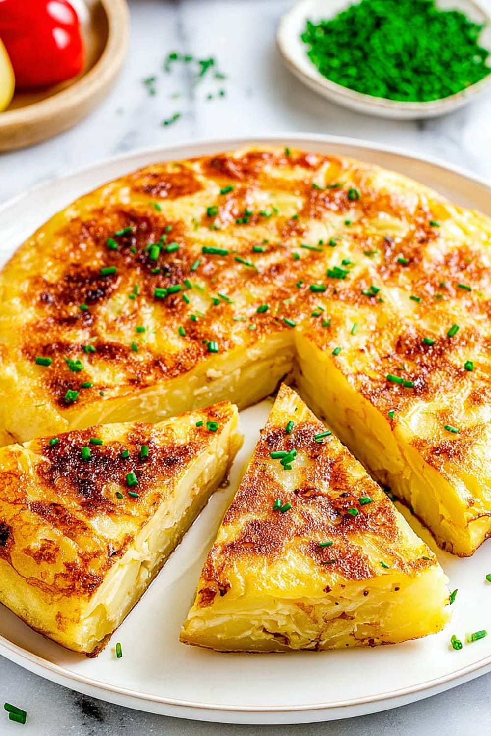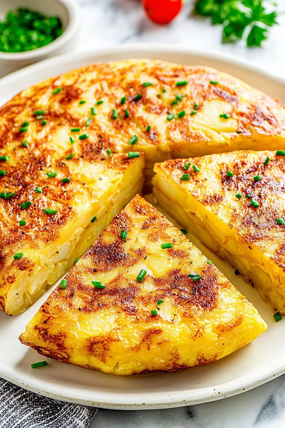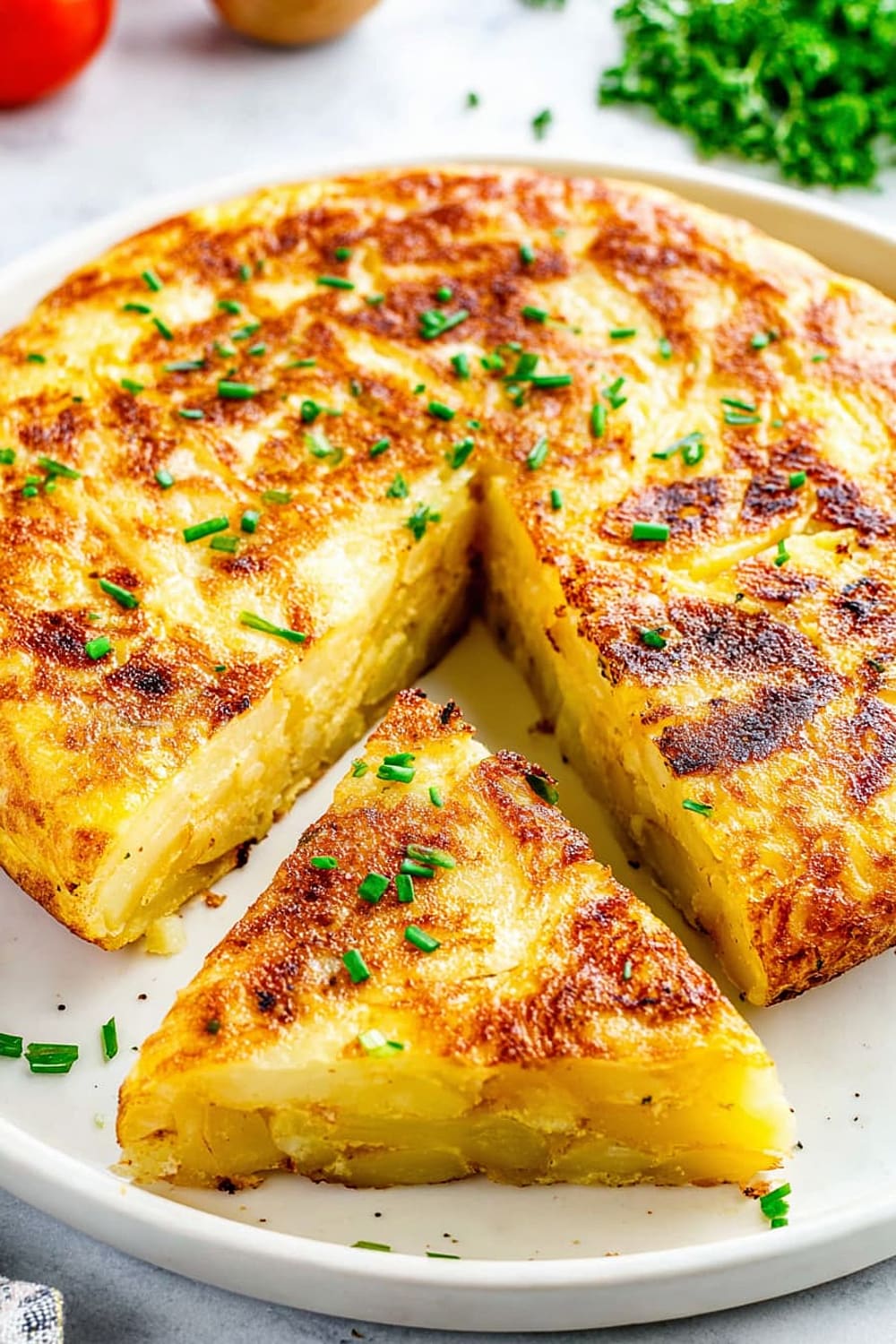 - 9 Remove from heat and either slide the tortilla directly onto a serving plate or repeat the plate-flipping technique for a perfect presentation. Garnish with chopped chives and let rest for 2-3 minutes before slicing. Cut into wedges like a pie and serve warm or at room temperature.