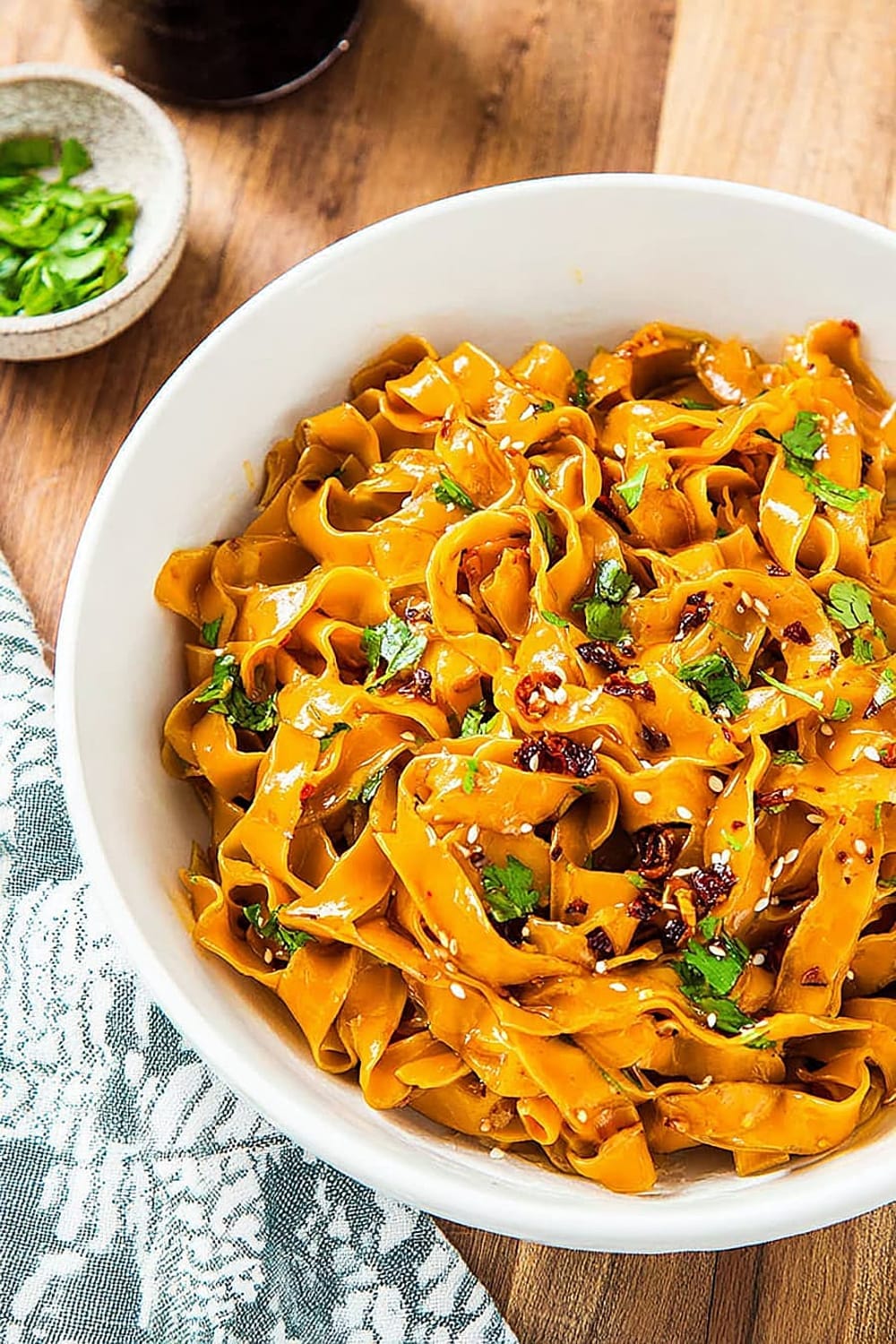 - 8 Divide the sauced noodles between two serving bowls and top generously with chopped scallions, fresh cilantro, and a sprinkle of sesame seeds. Serve immediately while the noodles are still warm and the aromatics are at their peak.