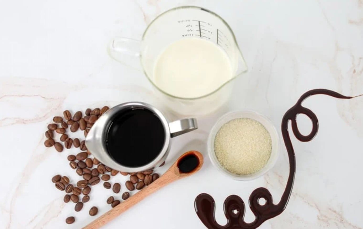 Here’s what you’ll need to make a Starbucks-style Cafe Mocha at home. The recipe is split into two parts – the mocha itself and the vanilla whipped cream topping.
