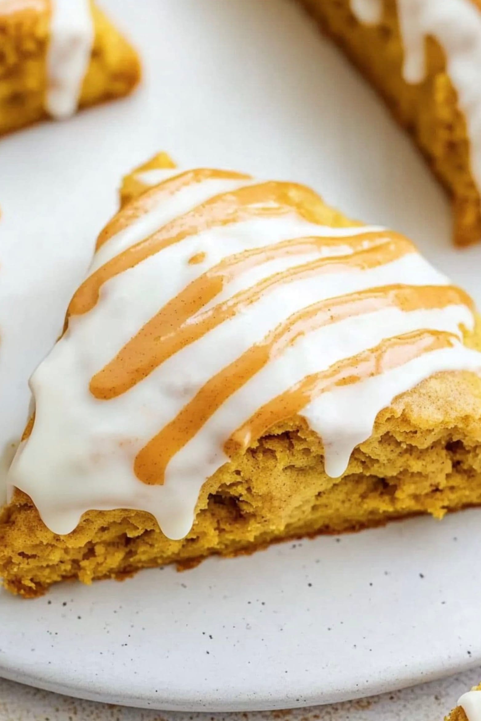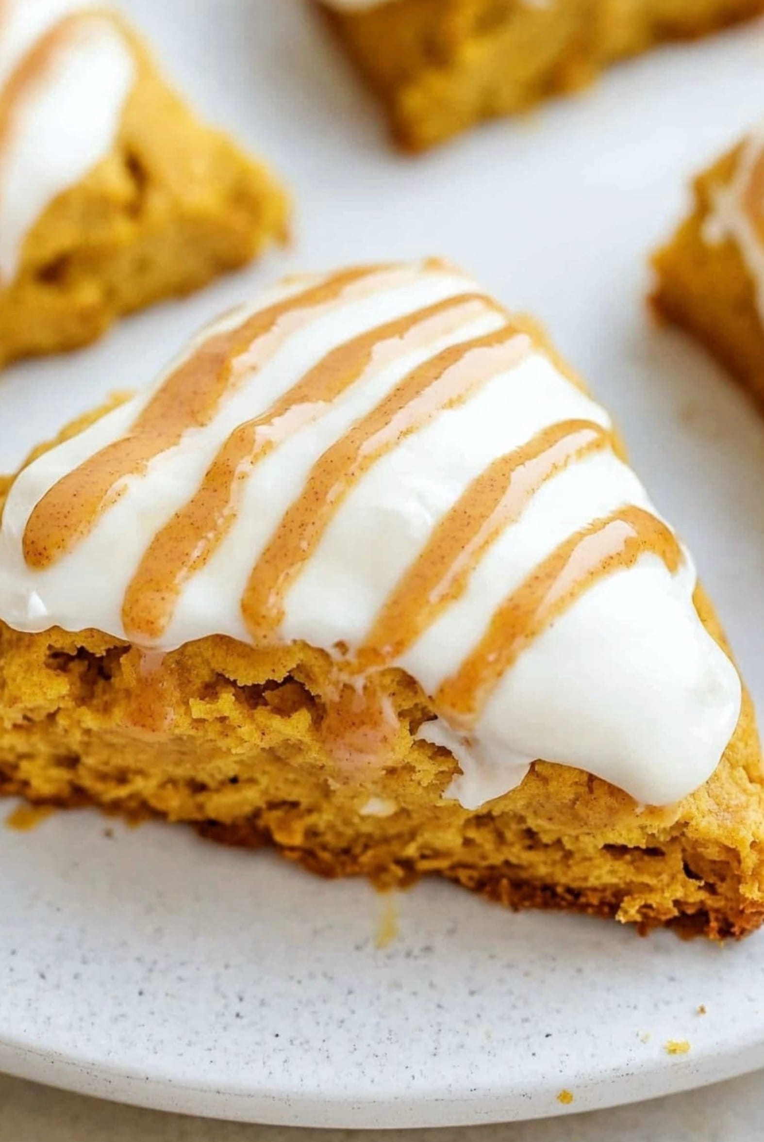 The scones have a tender, flaky texture from cold butter cut into the flour. Canned pumpkin and spices like cinnamon and nutmeg give them that classic fall flavor. A vanilla glaze and spiced pumpkin drizzle make them extra indulgent. Serve these scones with coffee or tea for a cozy autumn treat.