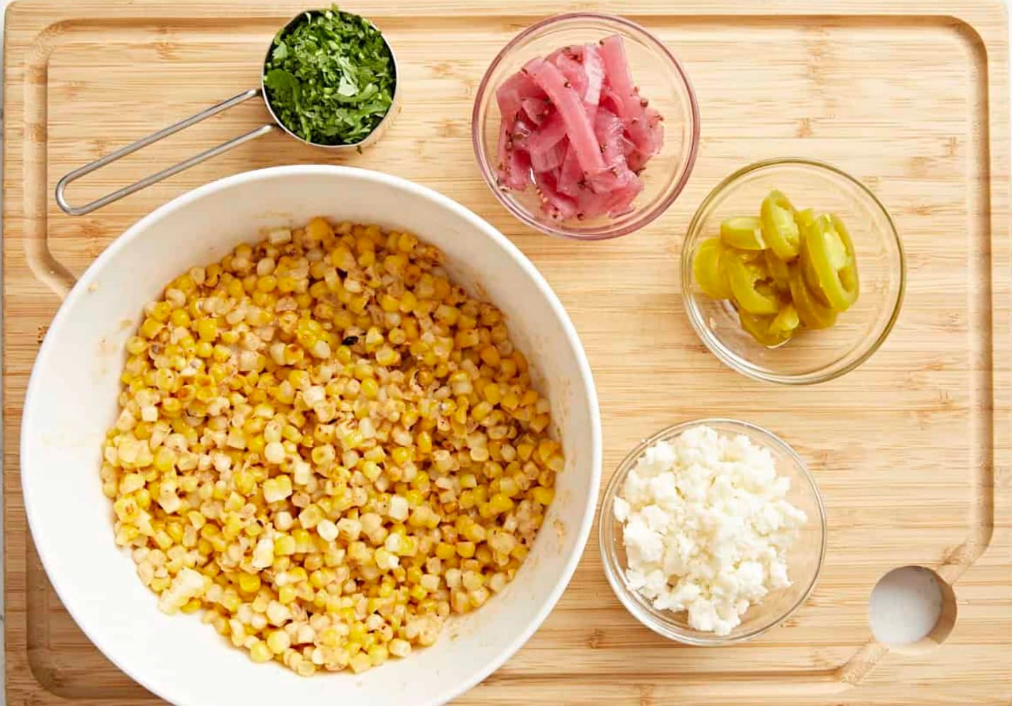 These pickled toppings give a nice tangy crunch and spice. Dice them small so they mix well with the corn. If you like heat, the jalapeños are a must-try addition to your salad.