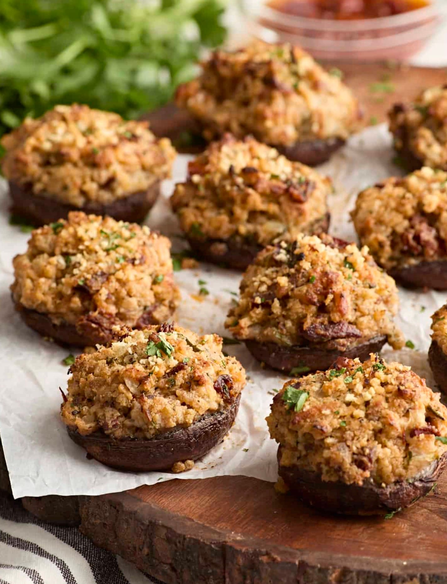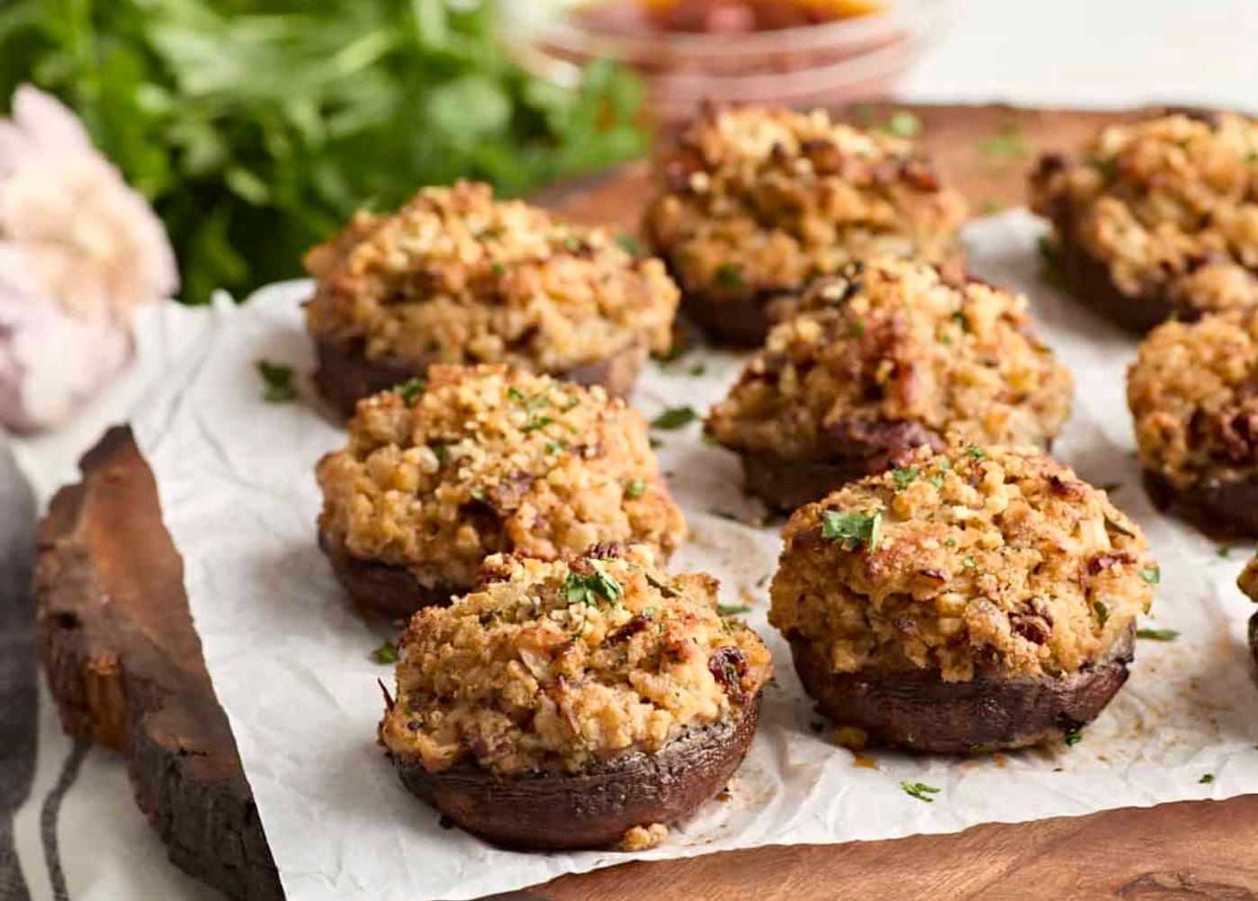 You can prep these mushrooms ahead of time. Make the filling and stuff the caps, then cover and refrigerate for up to 24 hours before baking.