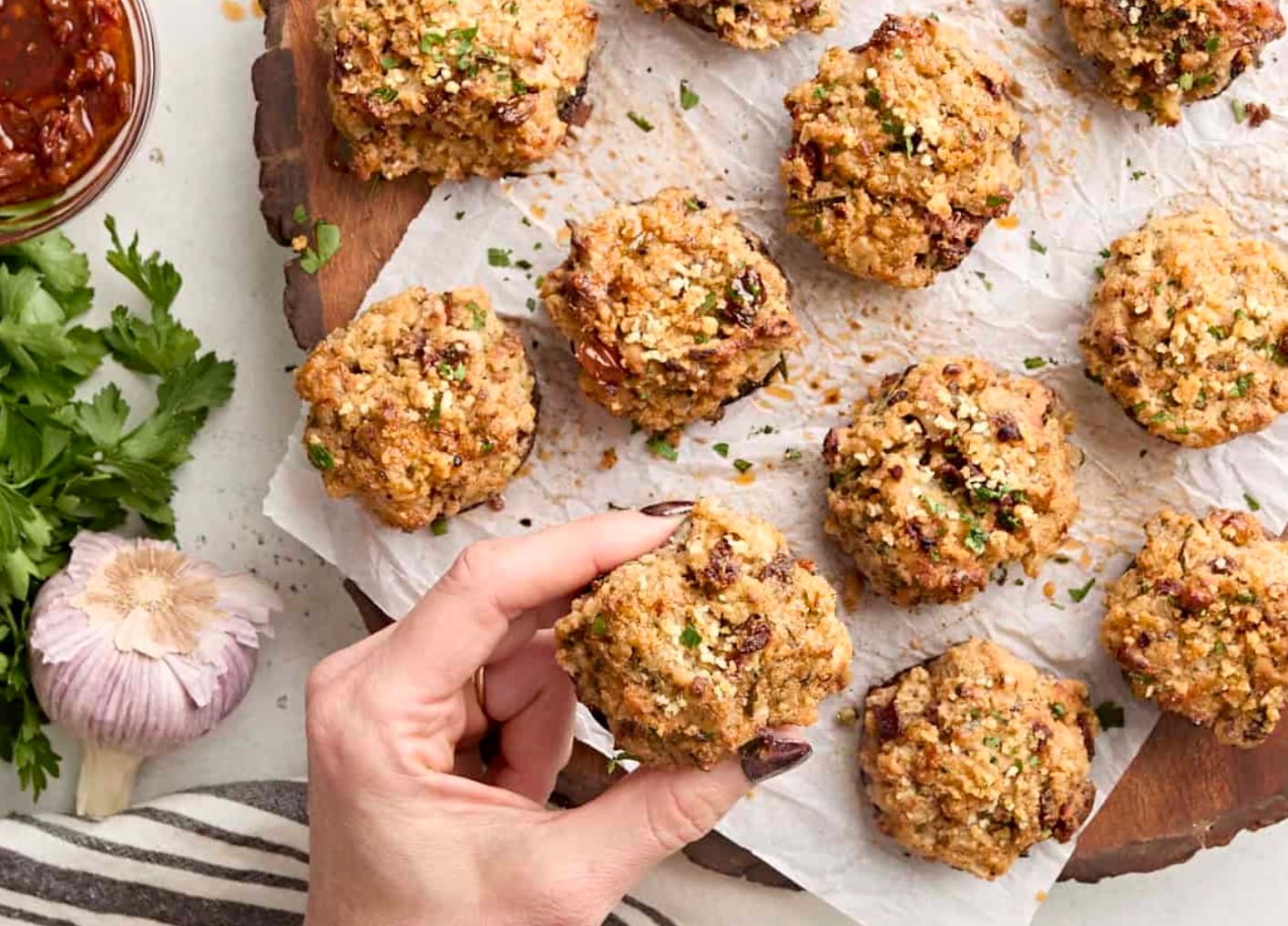 The filling is made by sautéing onions and garlic, then blending with cream cheese, walnuts, and seasonings. After stuffing the mushrooms, they’re baked until golden and bubbly. The result is a crowd-pleasing snack that’s perfect for parties or as a side dish.