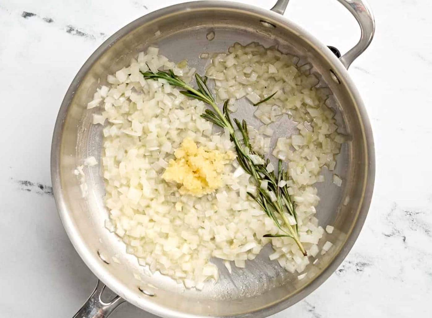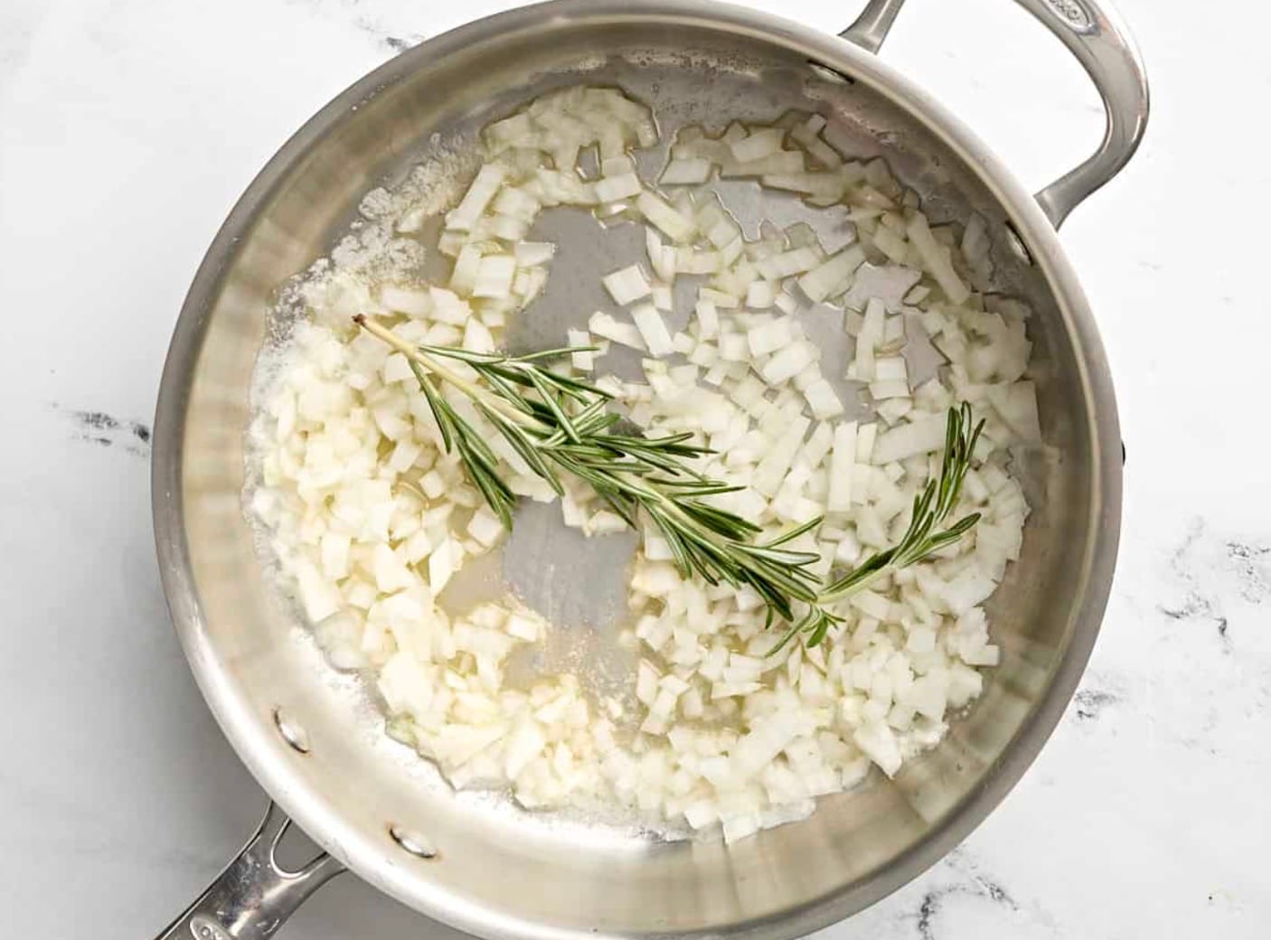 Melt butter in a skillet over medium heat. Add diced onion and rosemary sprig. Cook for 4 minutes until soft.