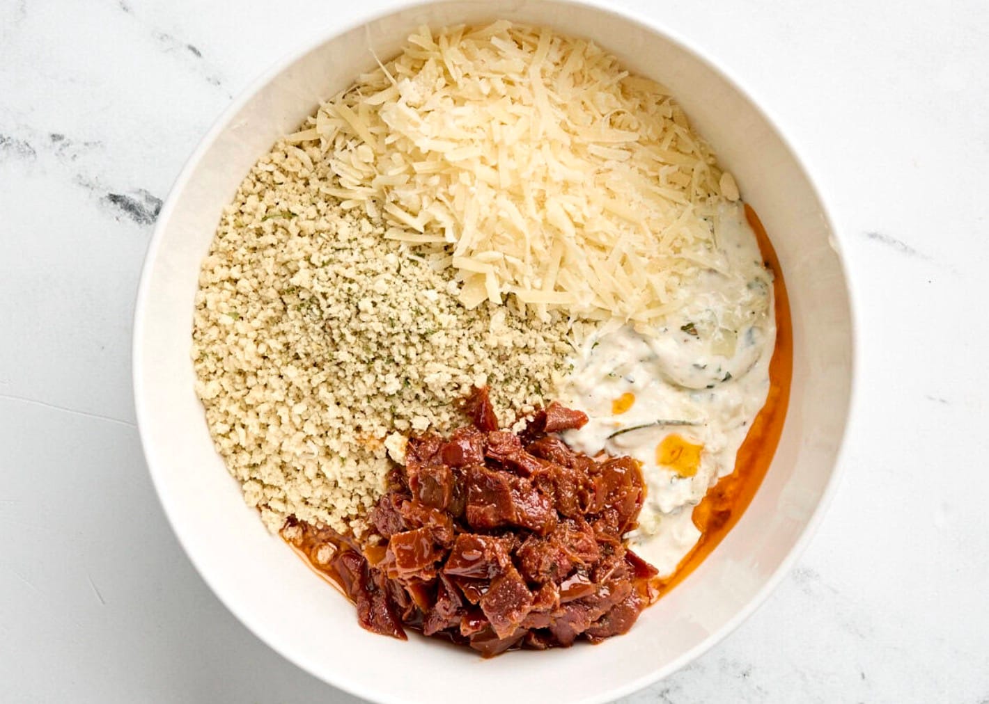 Mix in breadcrumbs, Parmesan, and sun-dried tomatoes.