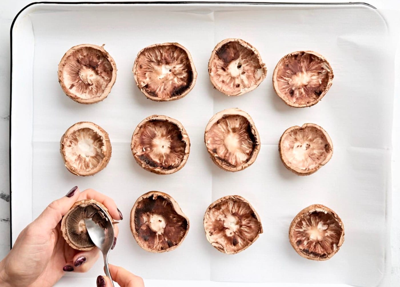 Clean mushrooms with a dry cloth. Pop out stems and scoop out gills with a spoon.