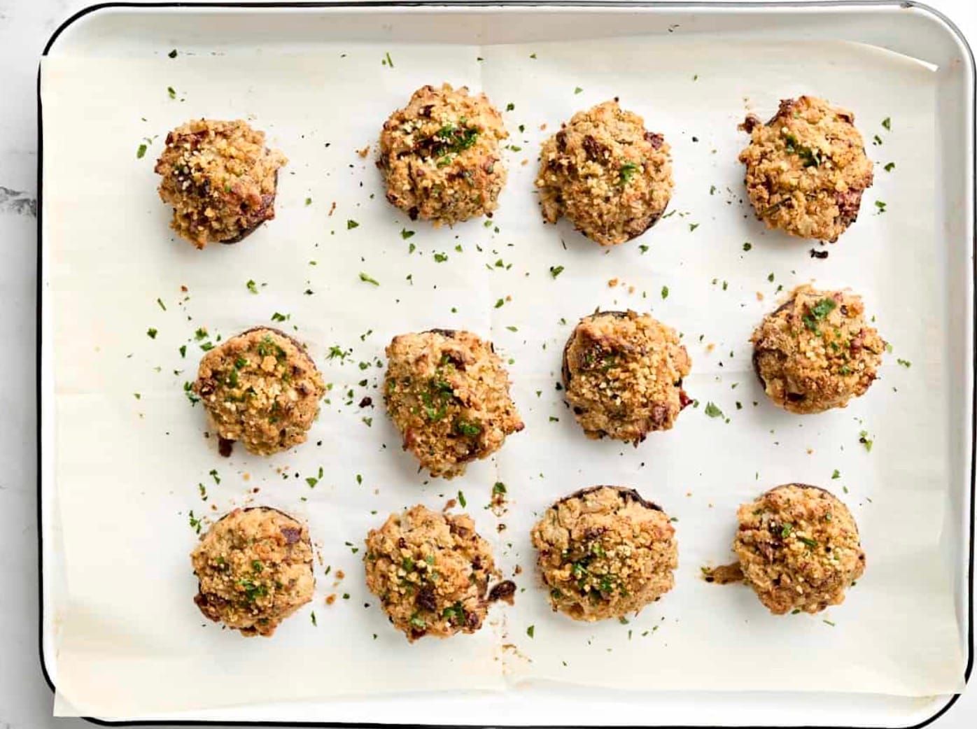 Grease a baking sheet and line with parchment. Arrange stuffed mushrooms on it.