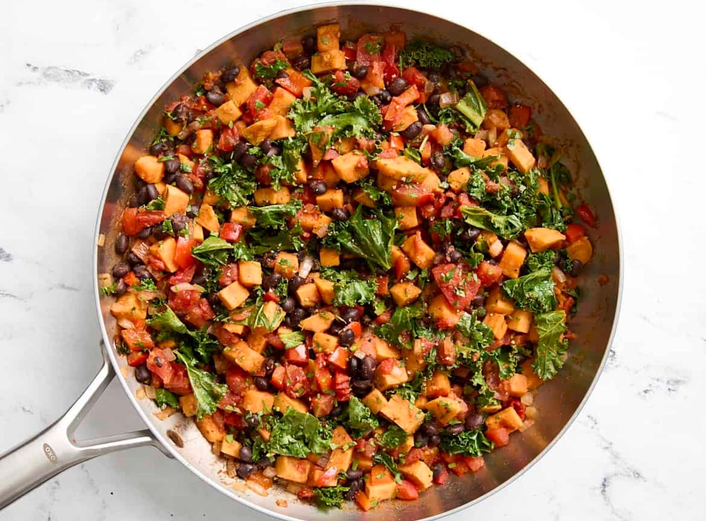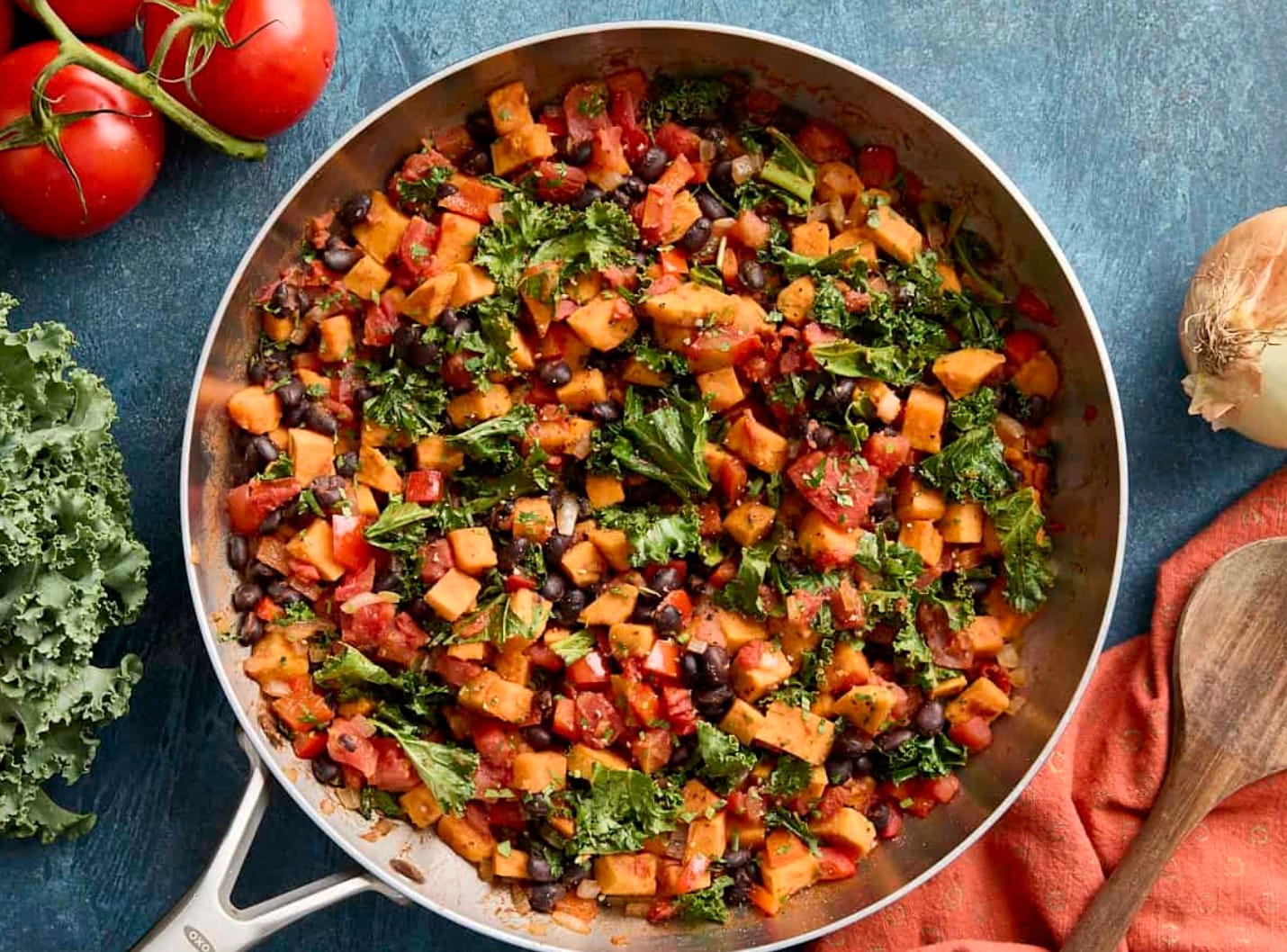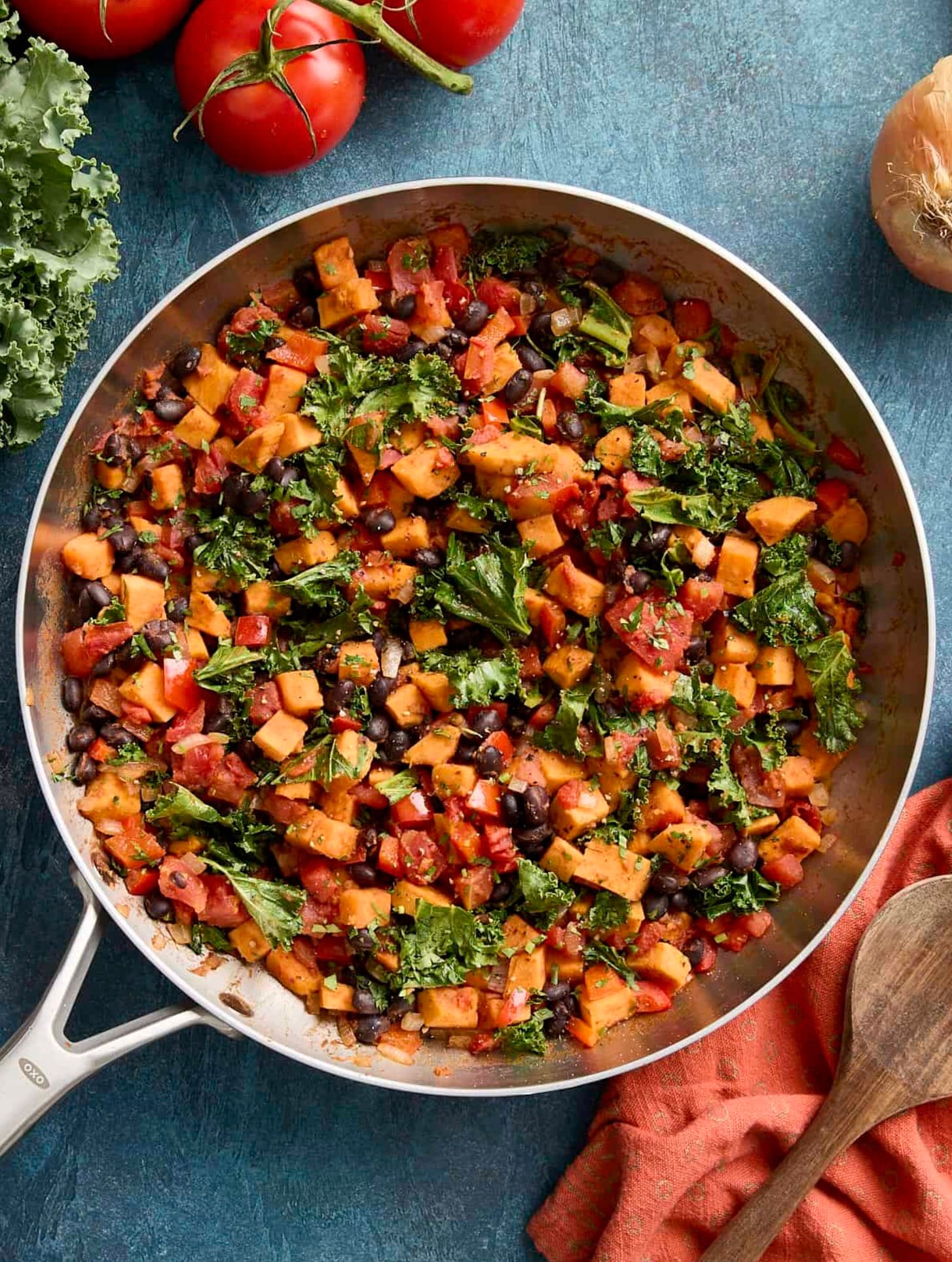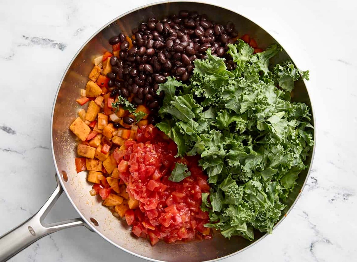 Next, they’ll heat up a big skillet and add the olive oil and sweet potatoes. After that, in go the rest of the veggies and spices. The black beans, tomatoes, and kale join the party last.