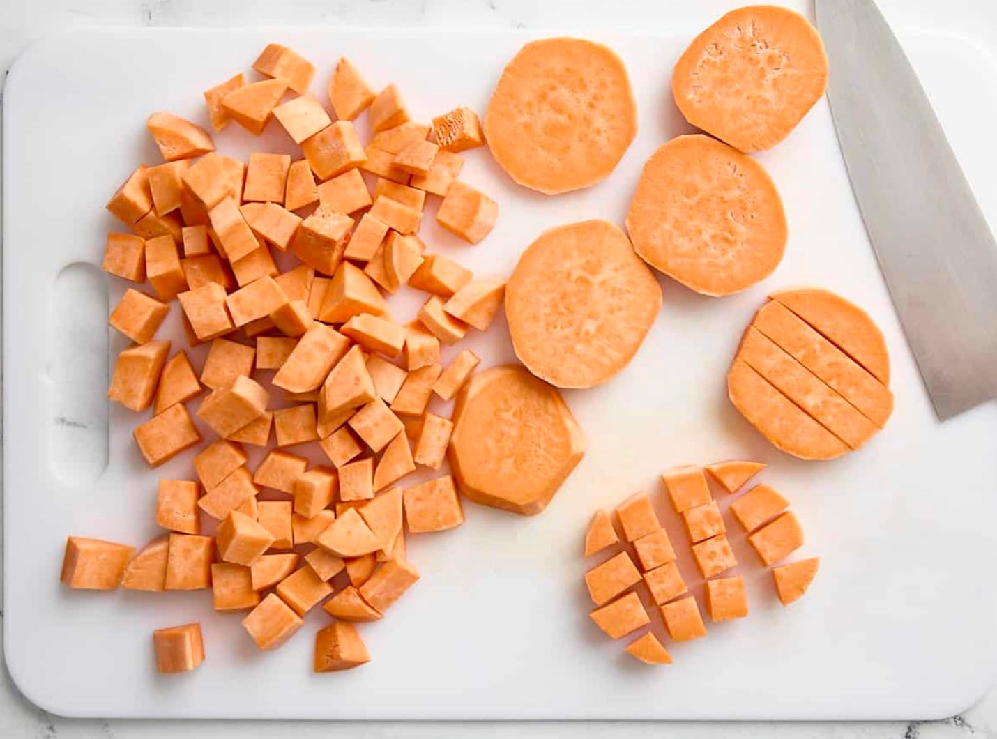 For the best results, cut the sweet potatoes into even-sized cubes. This helps them cook evenly and quickly. A sharp knife makes this task easier and safer.