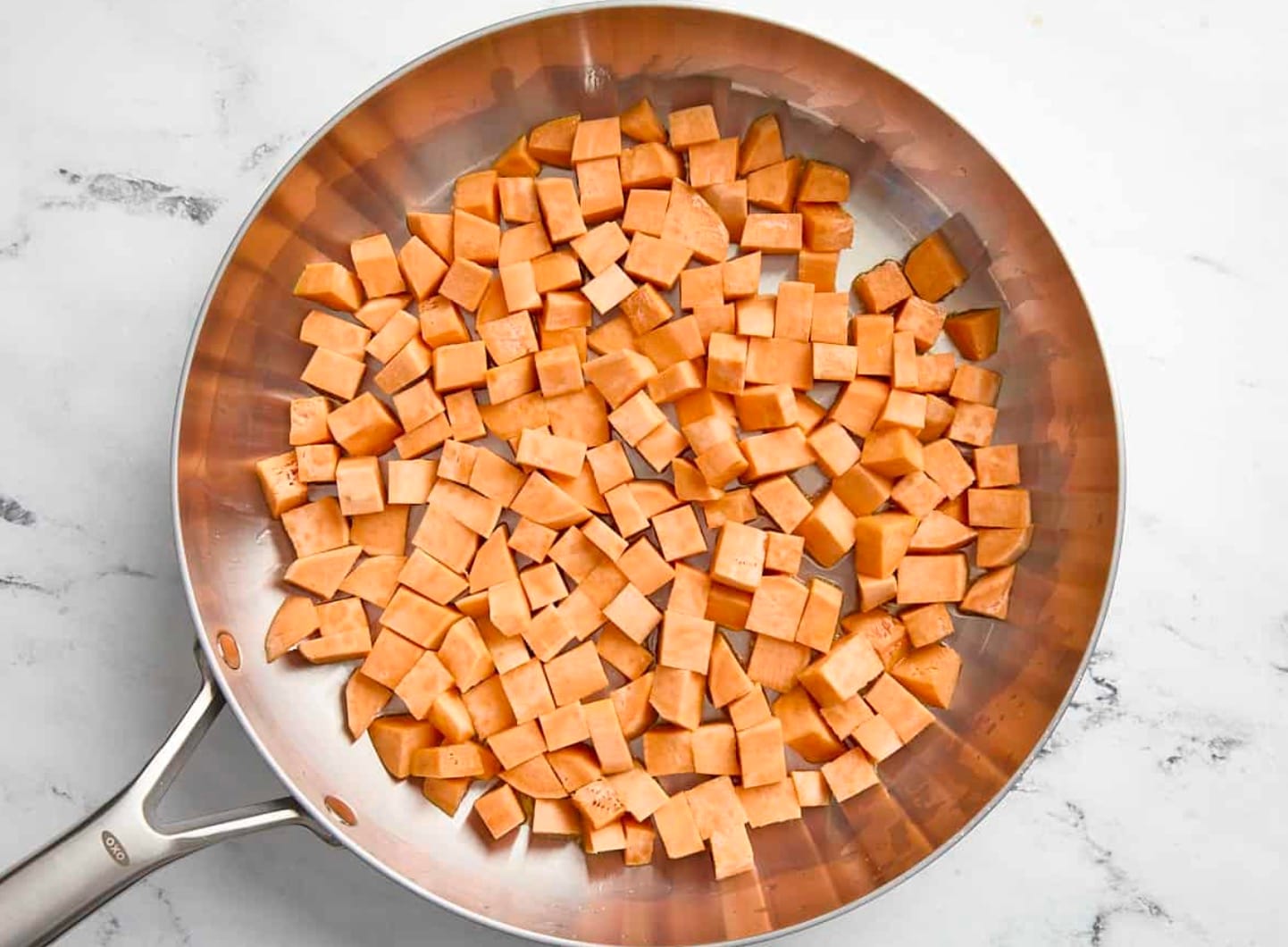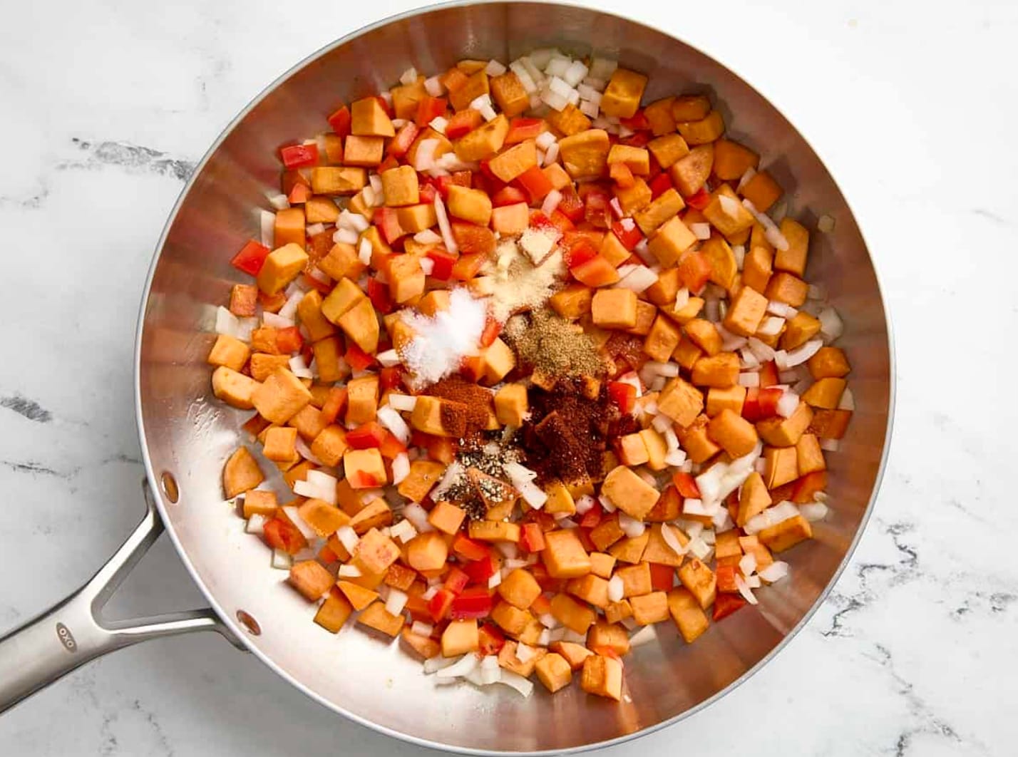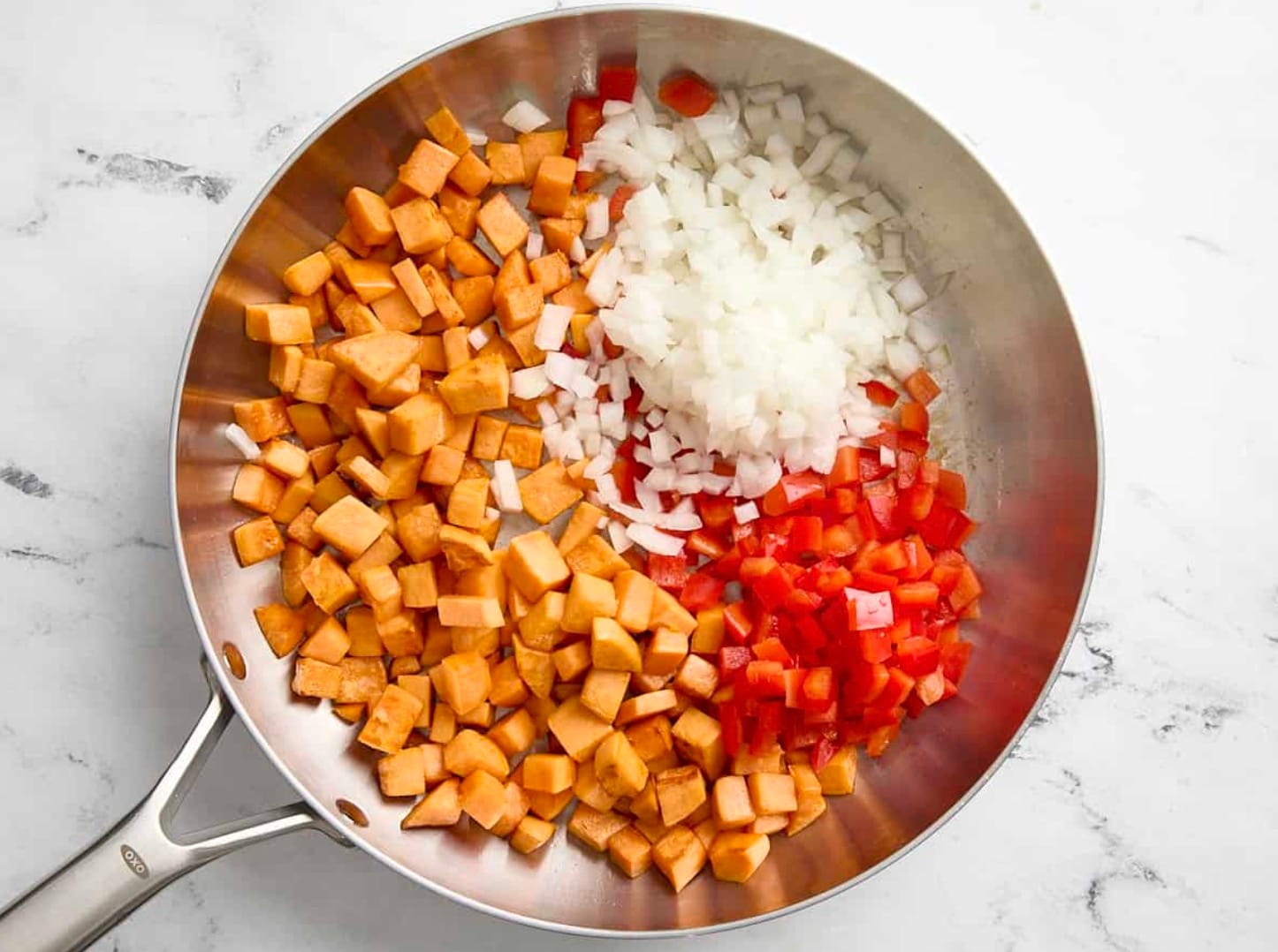The cook will start by washing, peeling, and dicing the sweet potatoes. Then they’ll dice the red bell pepper and onion. These veggies form the base of this yummy skillet meal.