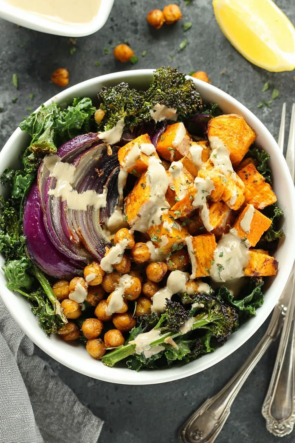 - 8 Slice the roasted sweet potatoes into bite-sized pieces using a sharp knife on a cutting board. Divide the warm roasted vegetables evenly between 3 serving bowls, creating colorful sections. Top each bowl with the spiced chickpeas and drizzle generously with the tahini sauce.